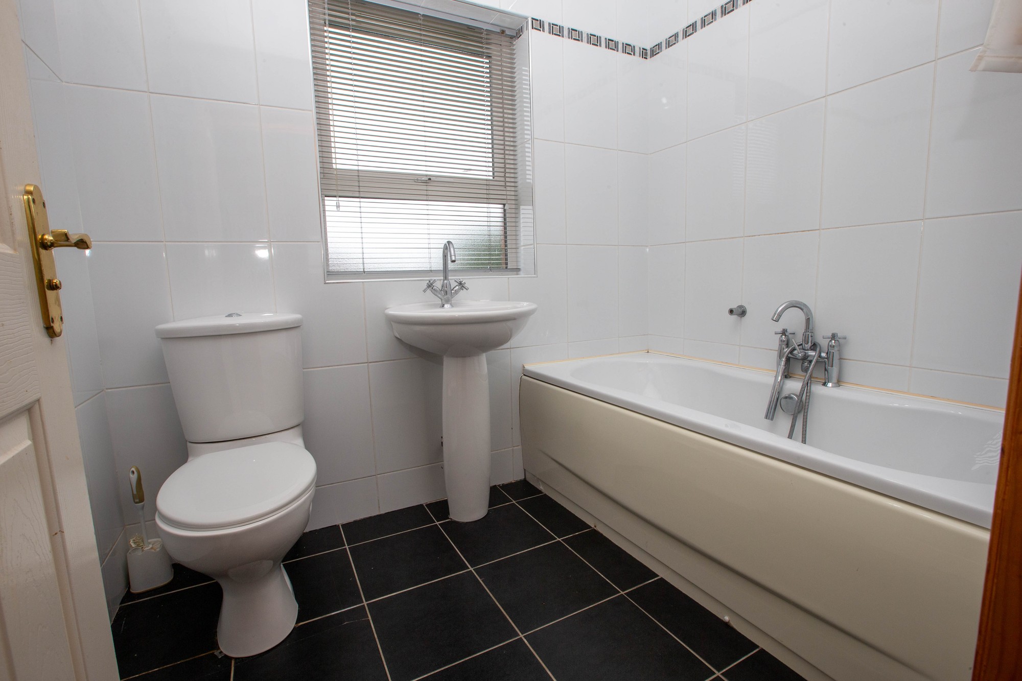 BATHROOM White suite comprising panelled bath with telephone shower fitting, wash hand basin and wc, tiled walls and floor.