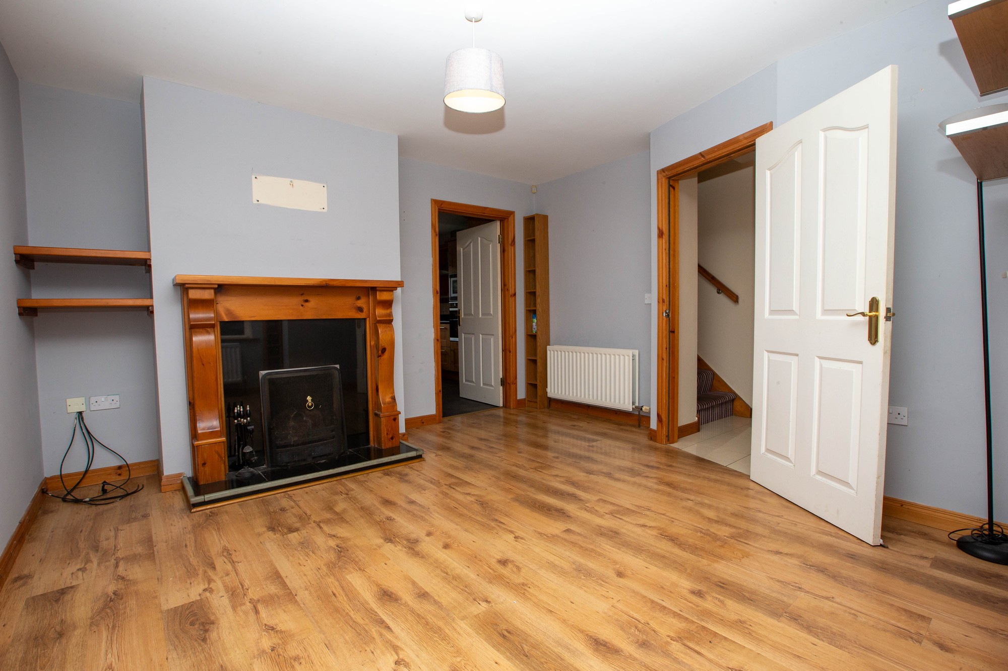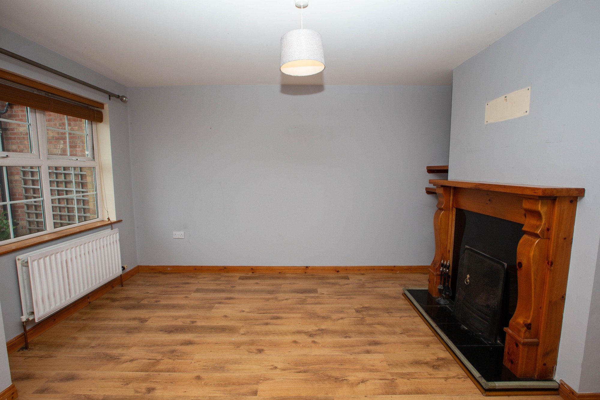 LIVINGROOM 13’9” x 13’0” (4.2m x 3.96m) - Feature pine fireplace with polished granite inset and hearth, laminate wood flooring.