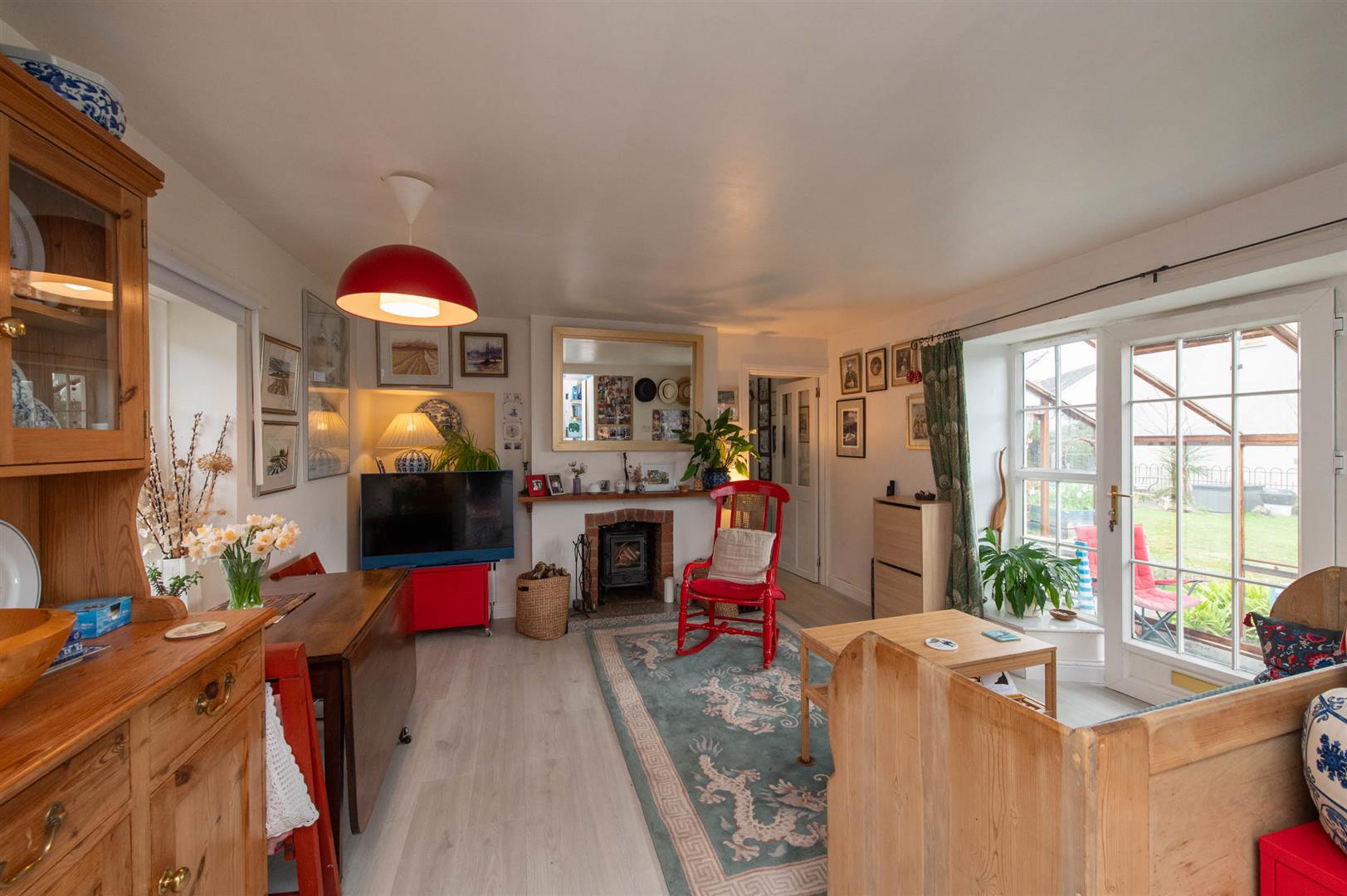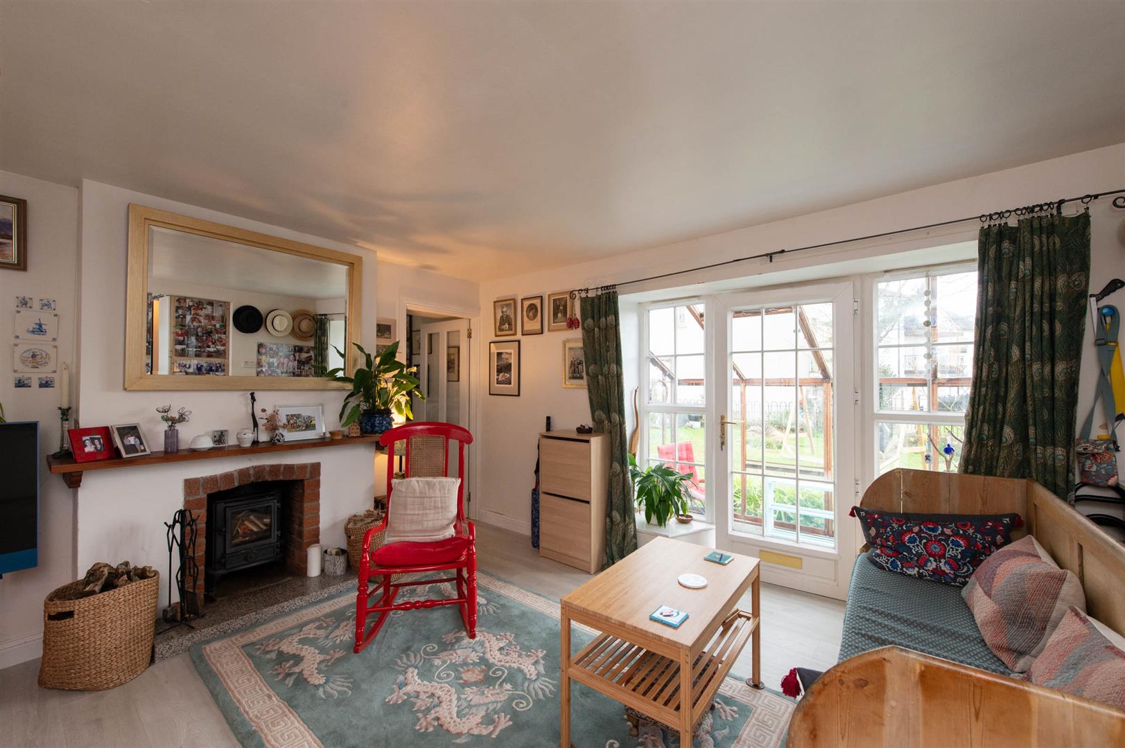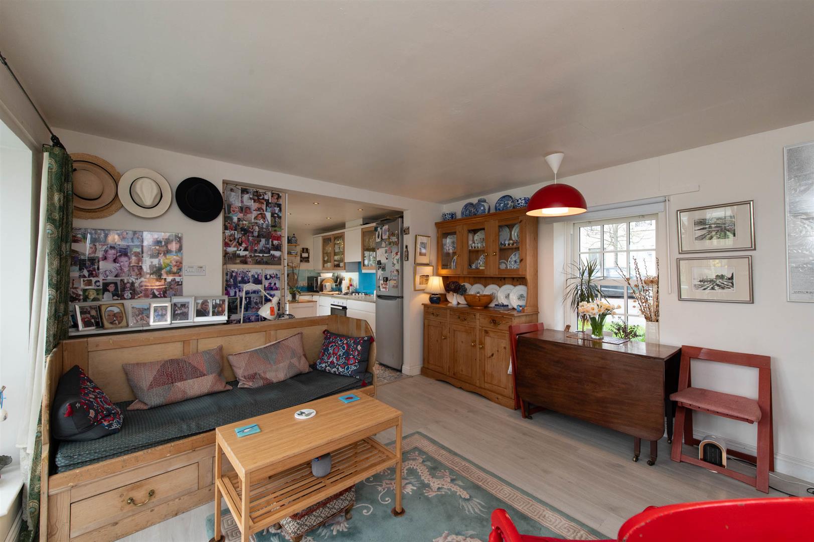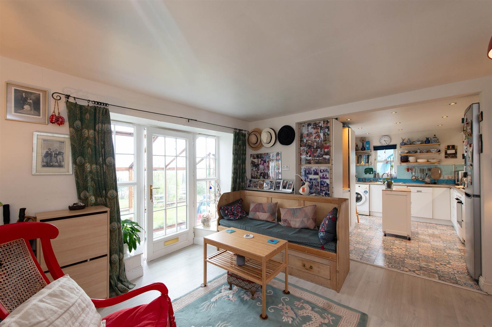 Accessed via the rear, this charming home opens into a bright, open-plan living and dining area, featuring a woodburning stove and a modern, open-concept kitchen. The kitchen overlooks the garden and is equipped with ample counter space, integrated appliances (gas hob, electric oven, dishwasher, and fridge freezer), and a dedicated recess for a washing machine. From the main living area is a versatile family room, boasting dual-aspect windows that fill the space with light. The property is completed by a bathroom and two comfortable bedrooms, with the master to include an ensuite shower room. Easily accessed by a fold-away ladder, the insulated loft space is finished with carpeting and paint, featuring eco-friendly lamb's wool throughout.