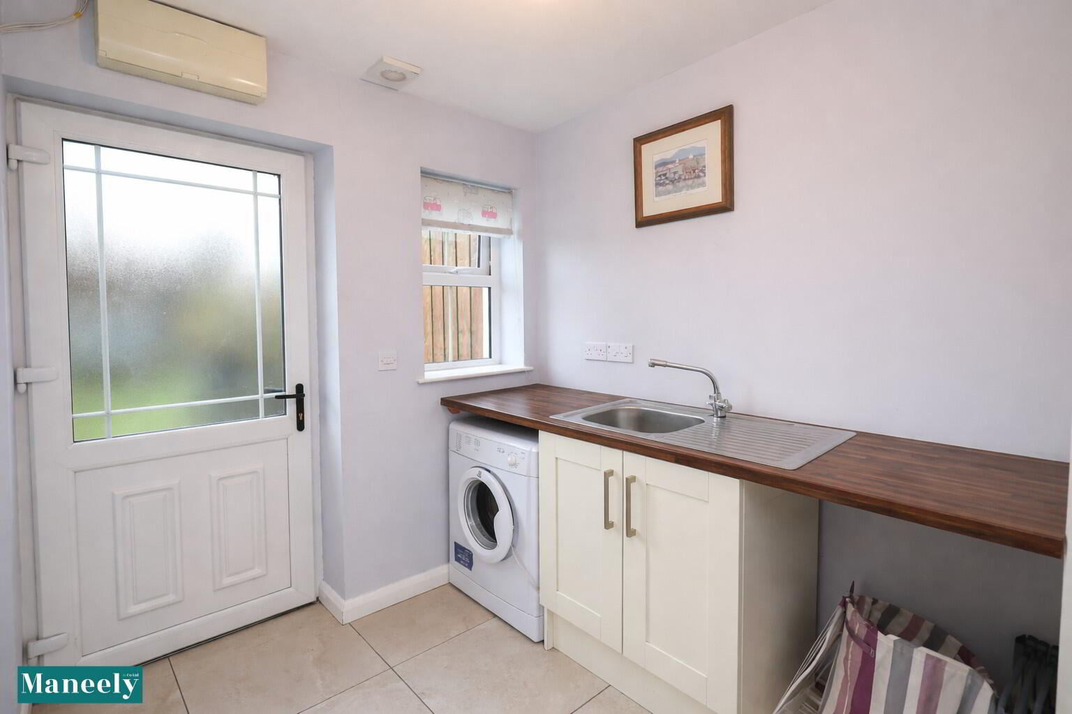 A practical and spacious utility area with additional high and low level storage units, stainless steel sink, plumbing for auto washers, extractor fan and power points. Tiled flooring and rear door access to the garden.