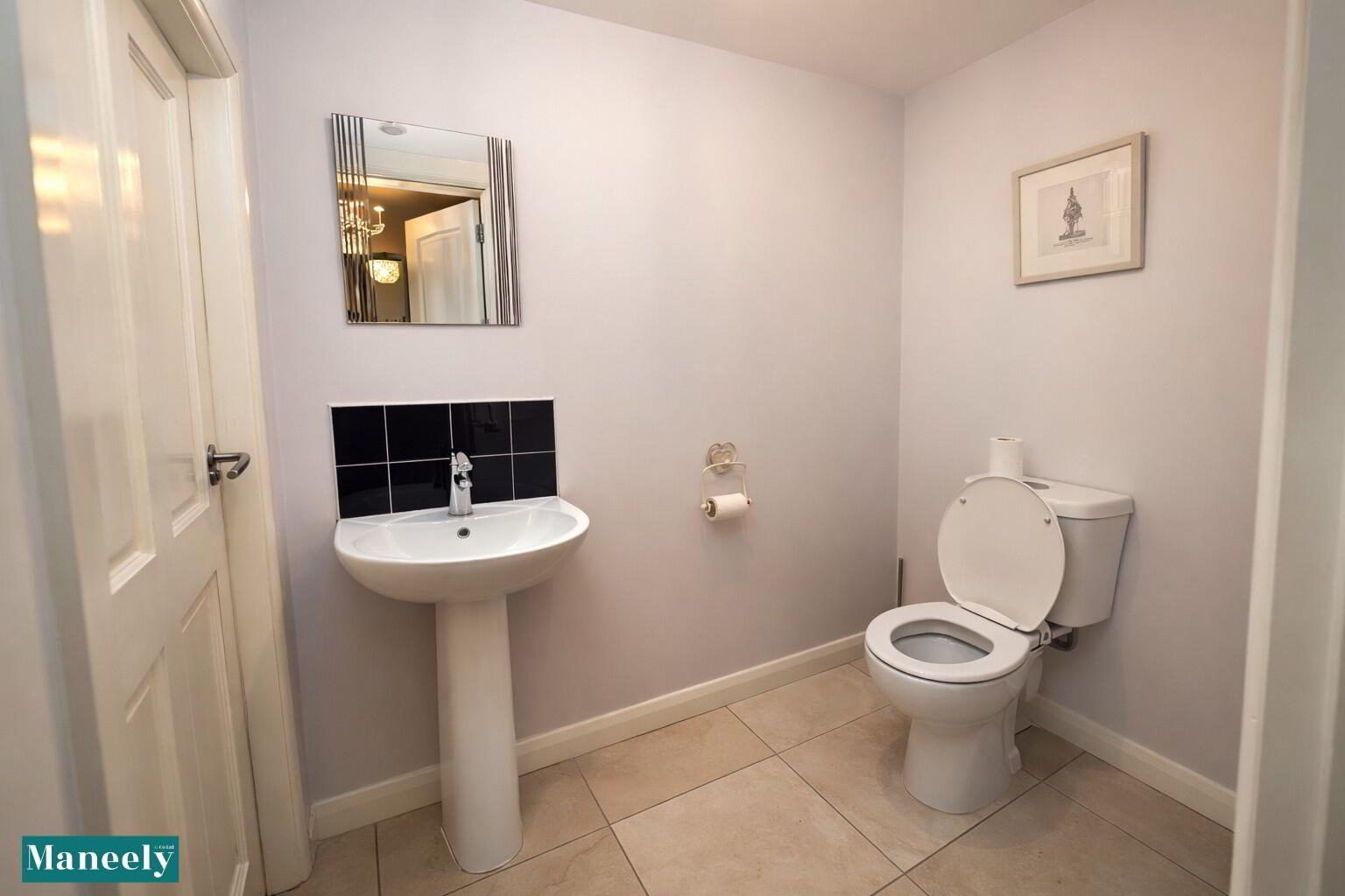 Ground floor WC which includes a 2 flush wc and pedestal wash hand basin with mixer tap and tiled splash back. Finished with tiled flooring.