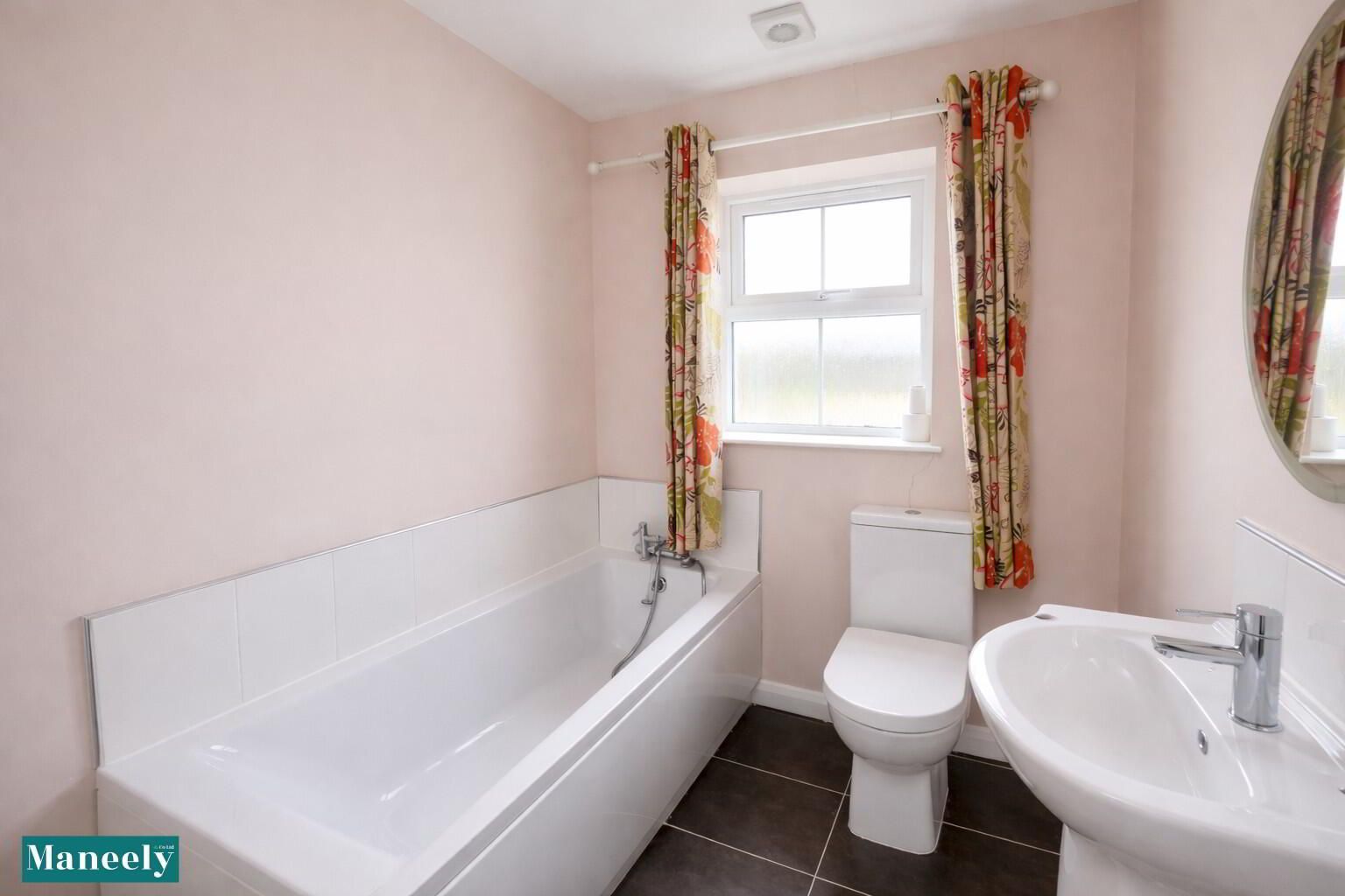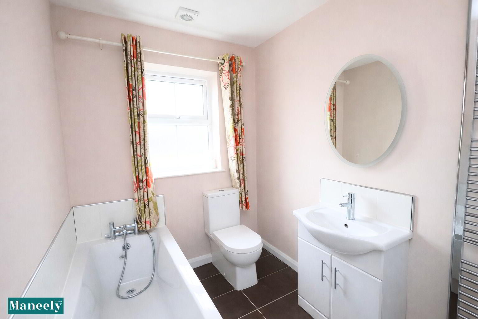 Tastefully finished with a modern suite including two-flush WC, panelled bath, vanity unit with wash hand basin and mixer tap, and separate corner shower with tiled surround and glass enclosure. Chrome towel radiator and extractor fan.