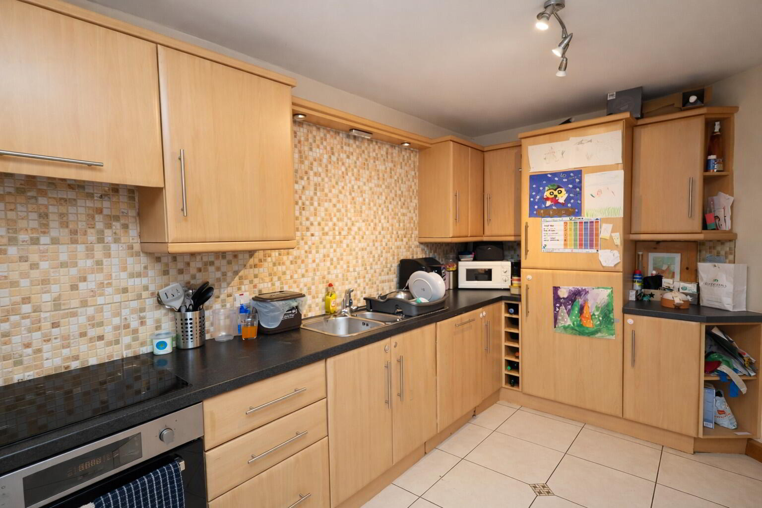 Well-appointed kitchen fitted with a range of high and low level units, stainless steel sink with drainer and extractor fan. Integrated appliances include a fridge freezer, dishwasher and cooker. Finished with tiled flooring and partially tiled walls. Power points.