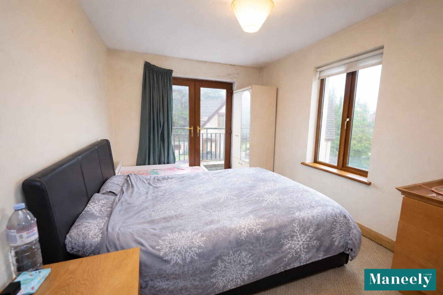 Generous double bedroom finished with carpet flooring and featuring PVC glazed doors leading to a private balcony. Power points.