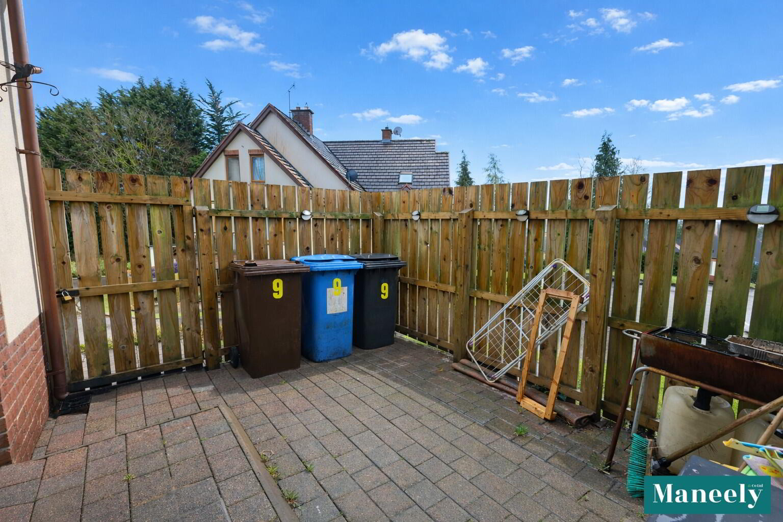 The property benefits from a spacious, enclosed side patio area with fencing, providing a private outdoor space ideal for relaxing or entertaining.