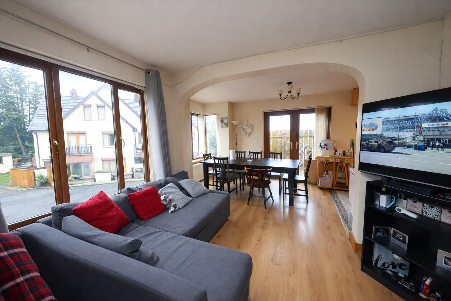 A bright front-facing reception room finished with laminate flooring and featuring an eye-catching open fire with tiled hearth. The space is open plan to the kitchen/dining area and benefits from TV and power points. French PVC doors lead to the enclosed side patio area.