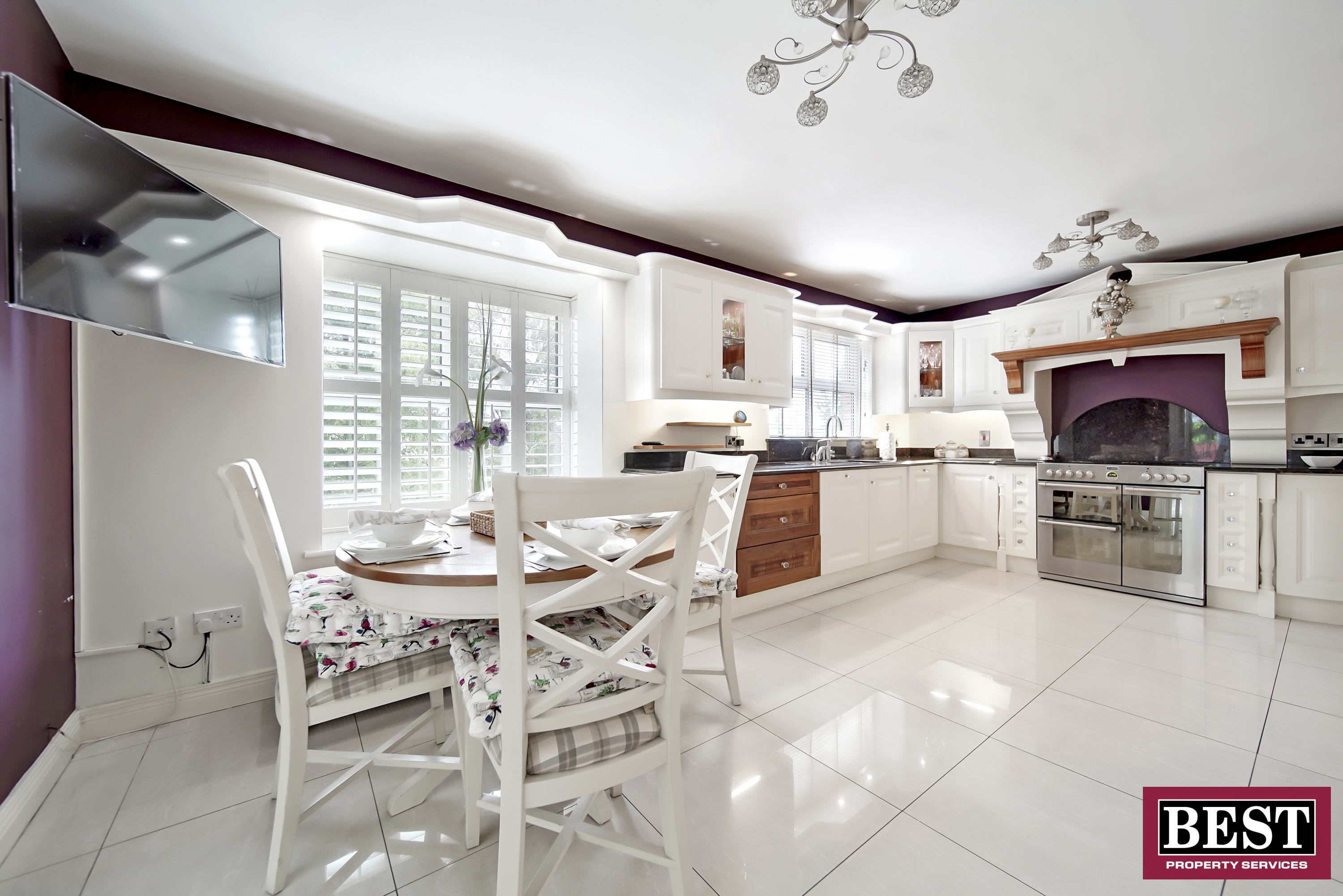 Tiled flooring , 3 oven electric range cooker, integrated dishwasher, fridge/freezer, fully fitted kitchen, stainless steel sink, downlights, wooden shutter blinds, integrated wine rack.