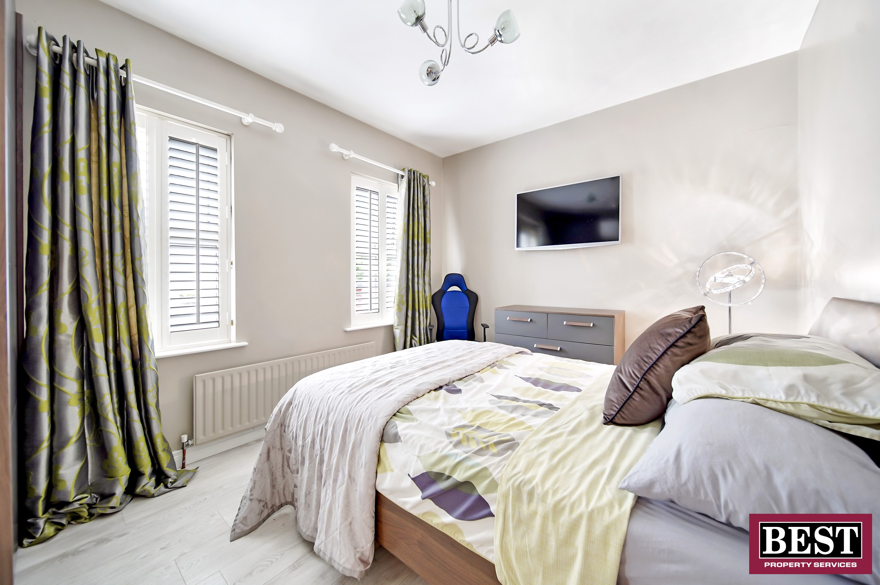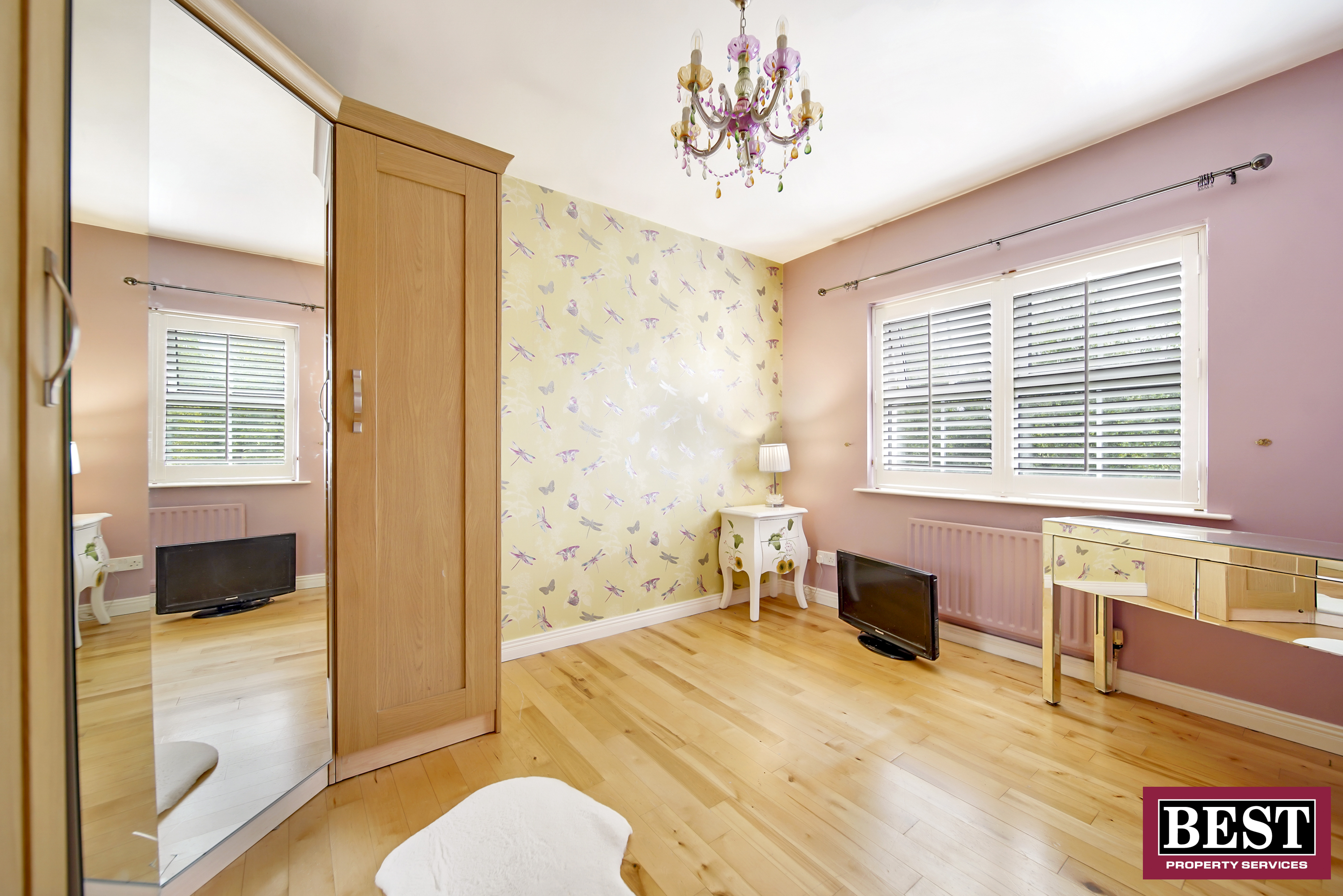 Wooden flooring, mirrored sliding door wardrobe, wooden shutter blinds.