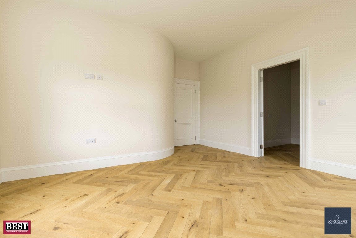 Dual aspect, curved wall, Herringbone style flooring, electrical socket, raised TV point.