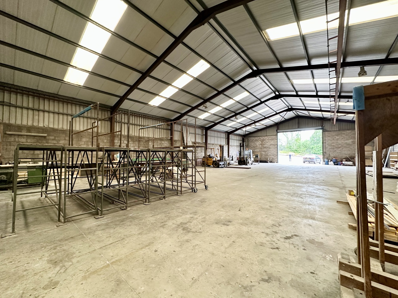 The warehouse is of steel portal frame construction with block walls and profile metal cladding. It features two roller shutter doors, 3-phase electricity, high internal eaves, concrete flooring, and overhead lighting throughout.