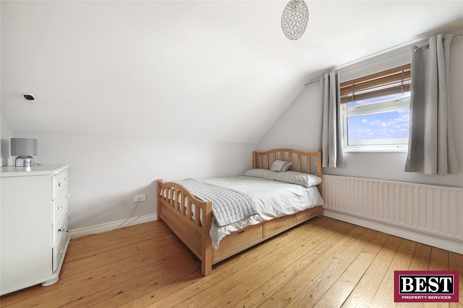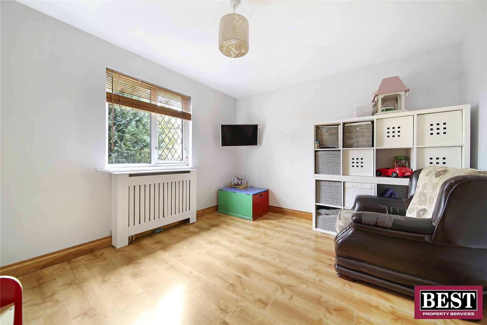 Laminate flooring, wooden radiator cover.