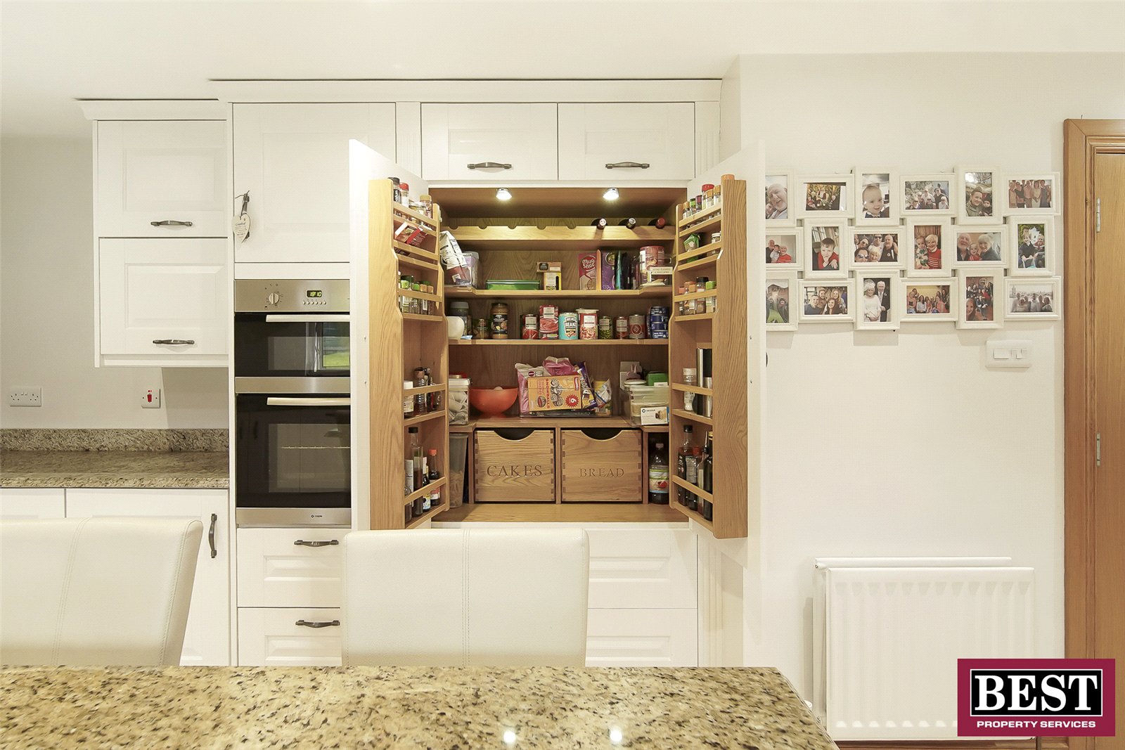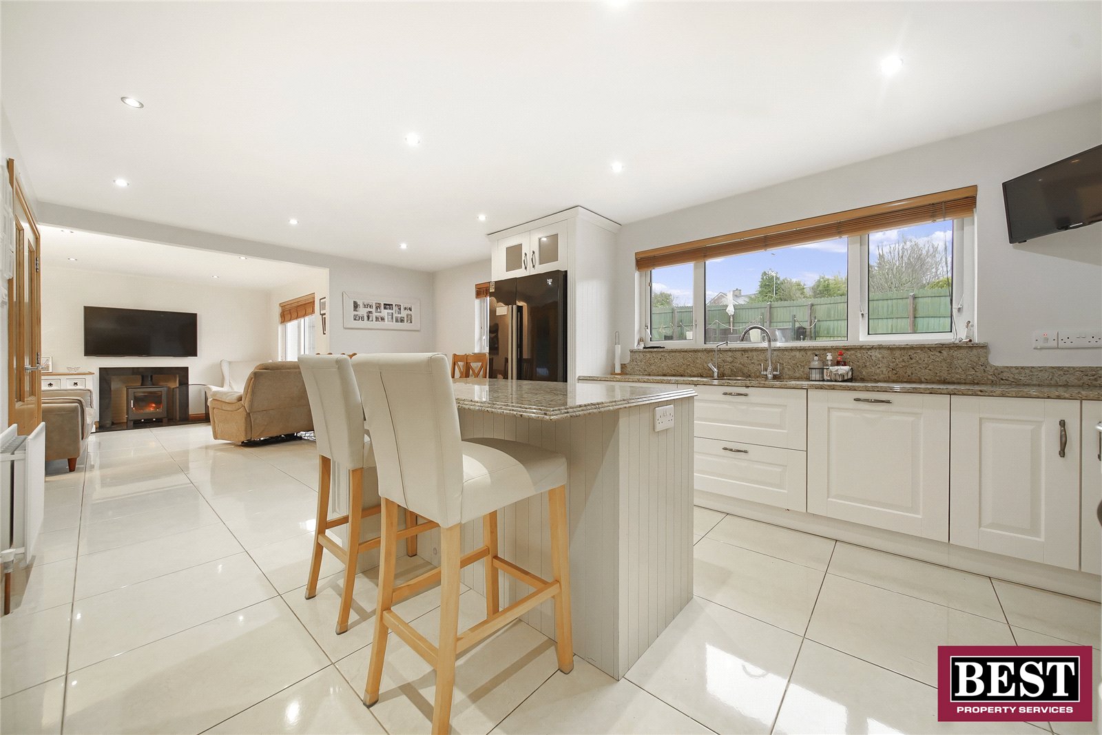 At the heart of the property is the impressive open-plan kitchen, dining and living area, designed for modern living. This space is centred around a feature island and fitted with solid oak cabinetry and granite worktops, including the island. Additional features include a Quooker tap and a practical larder with wire rack storage.