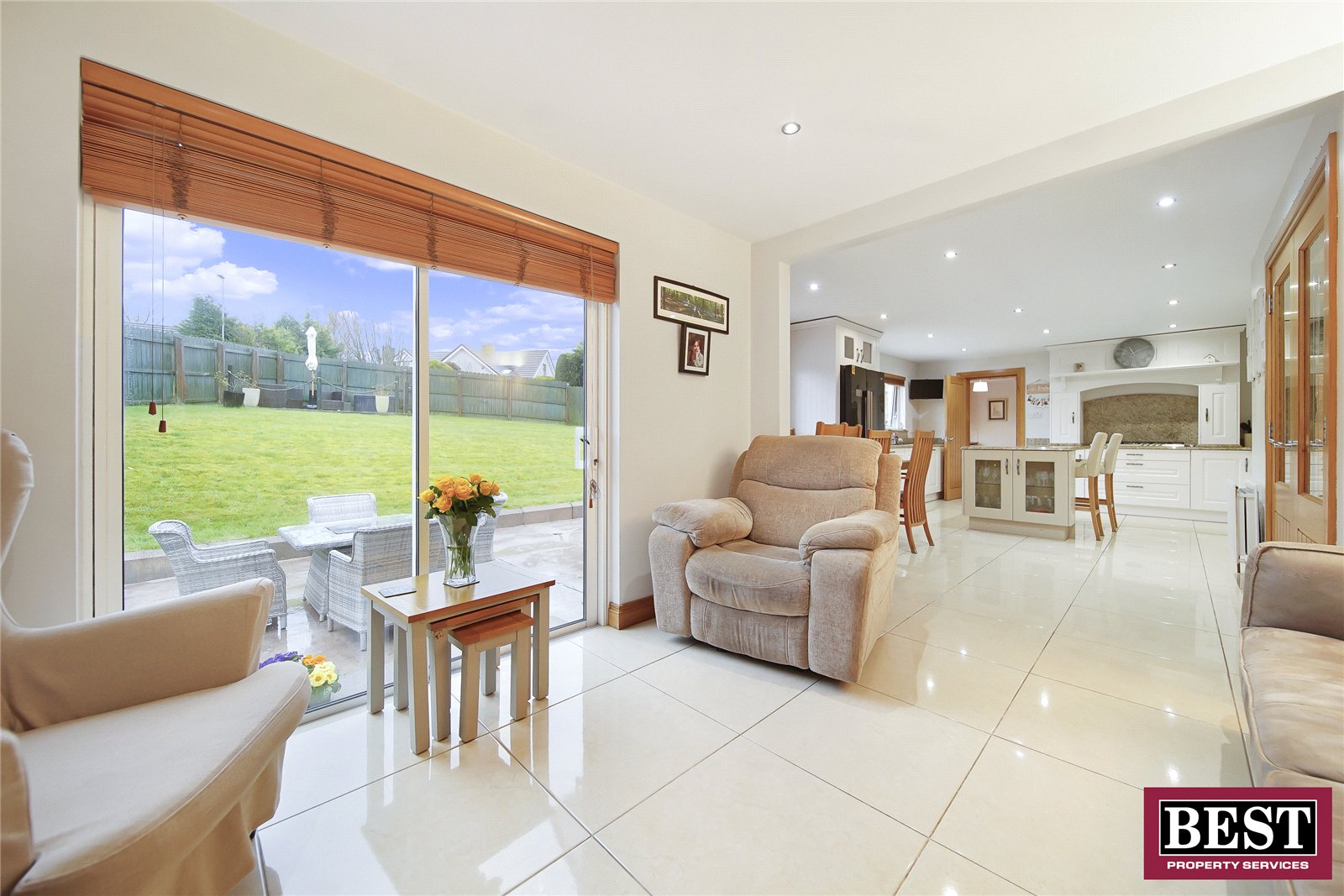 Tile flooring, cast-iron stove with stone hearth and surround with brick feature, sliding glass doors opening onto the patio and rear garden, and recessed downlights.
