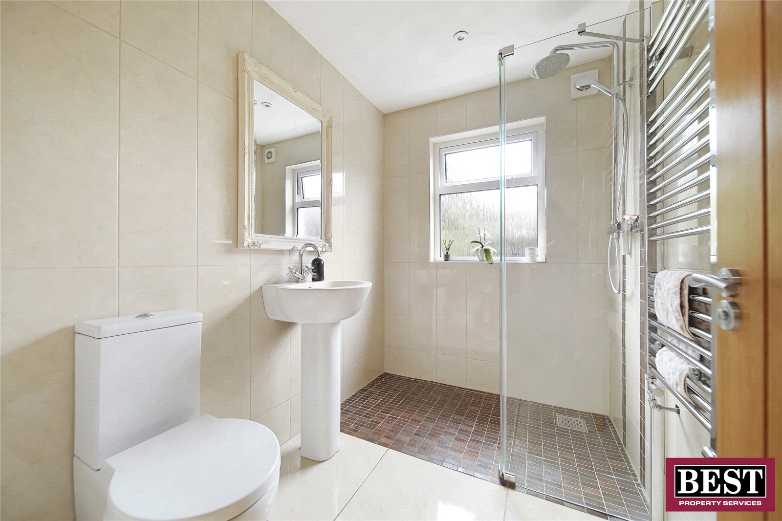 Fully tiled, mirror, chrome dual-outlet shower with glass panel, chrome towel rail