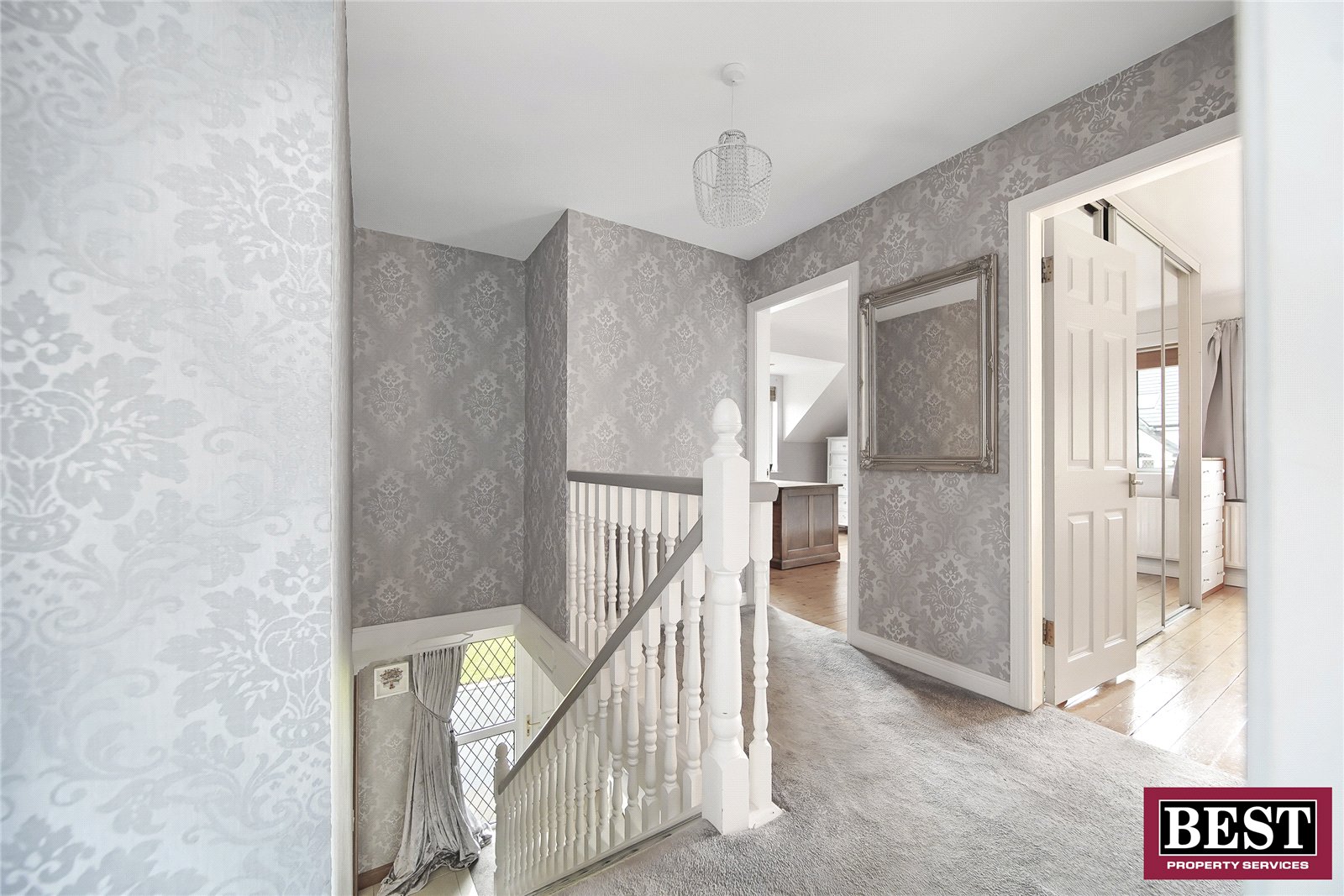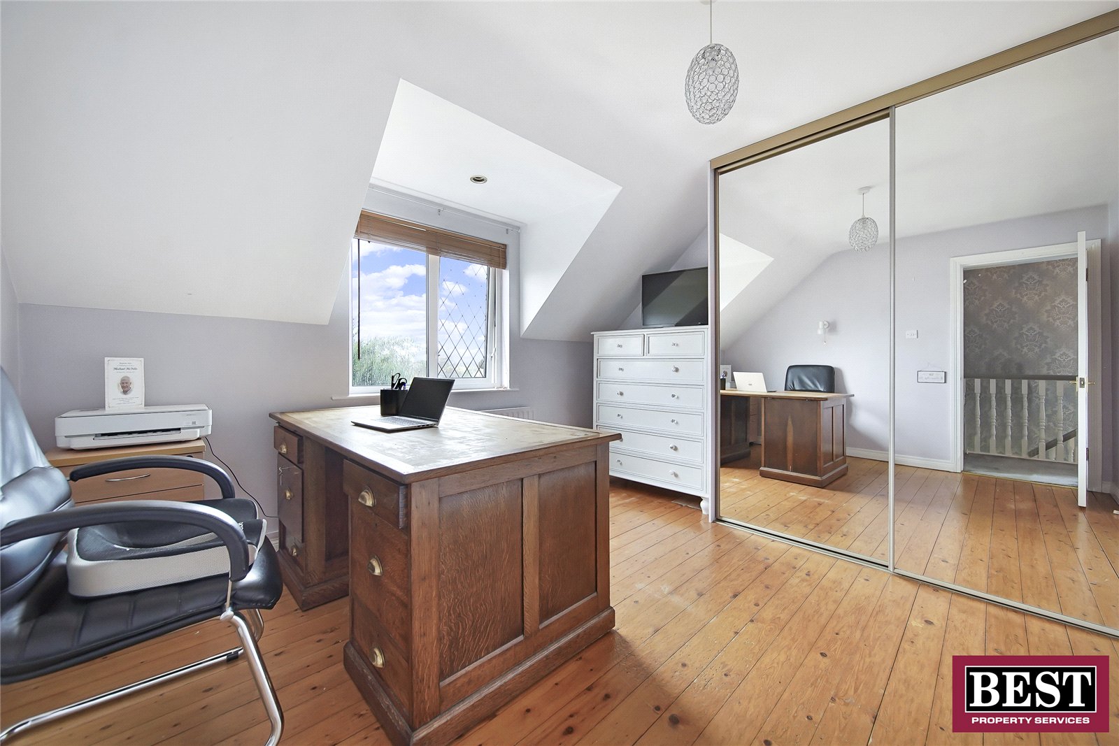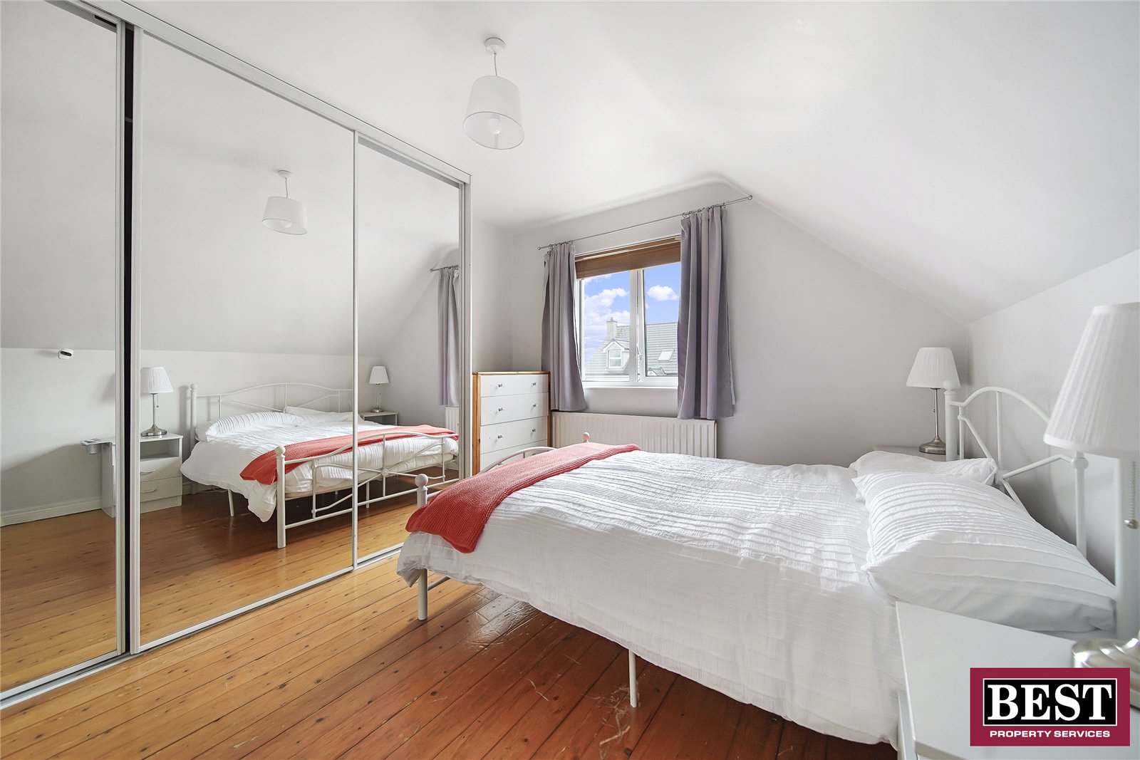 Wooden flooring, sliding mirror wardrobe.