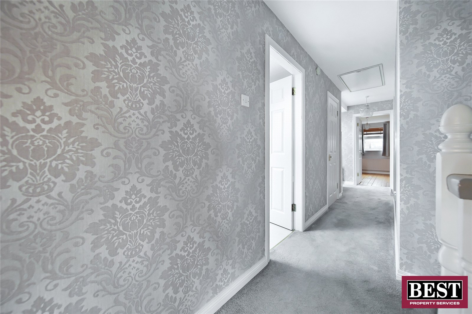 Carpet flooring, access to attic via pull-down ladder.