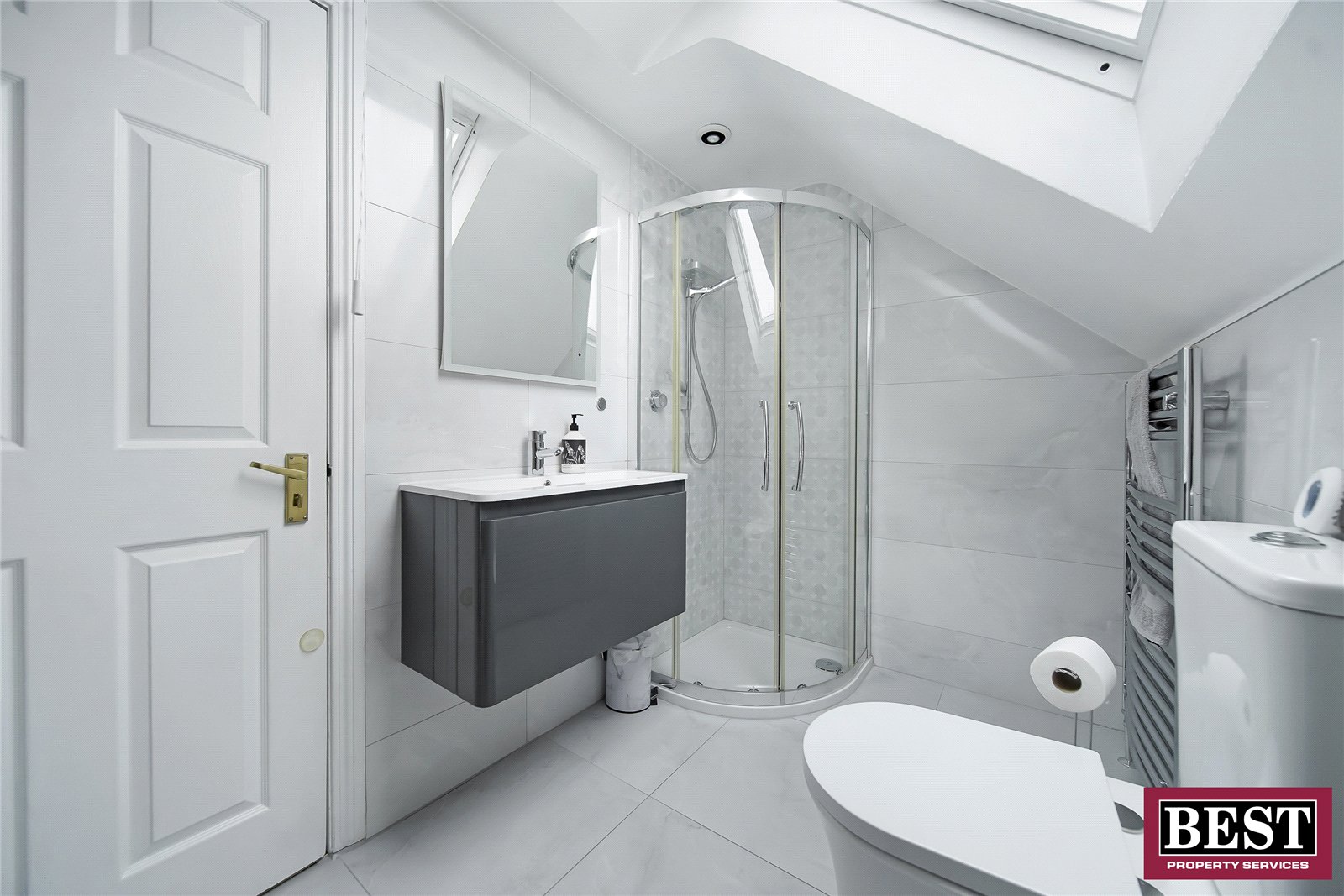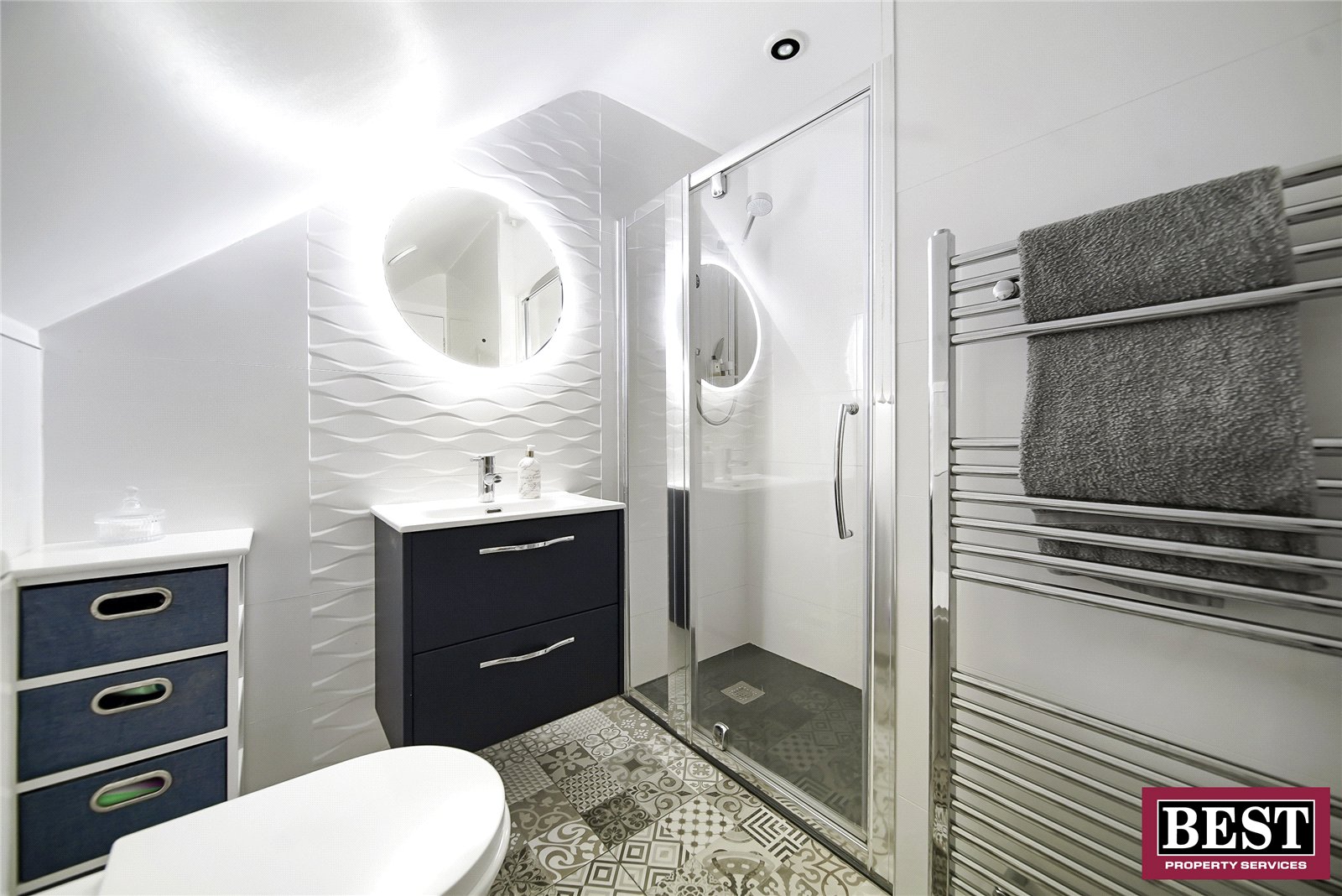 Fully tiled with mosaic tile flooring, featuring a walk-in shower with glass panel enclosure and Mira Sport electric shower with integrated shower tray, chrome towel rail, floating vanity unit with basin and chrome tap, and LED mirror.