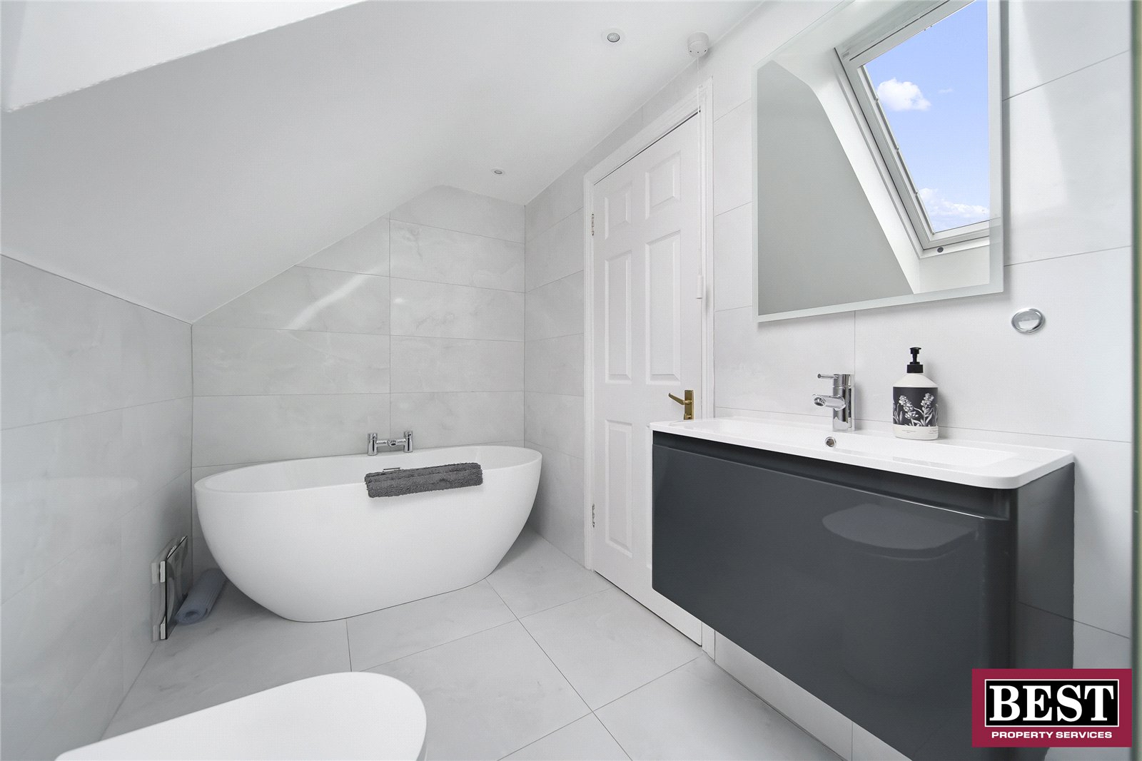 Fully tiled, featuring a floating vanity unit with basin and chrome finishes, corner shower with glass enclosure and dual-outlet chrome fittings, chrome towel rail, oval freestanding bath, downlights, and LED mirror.