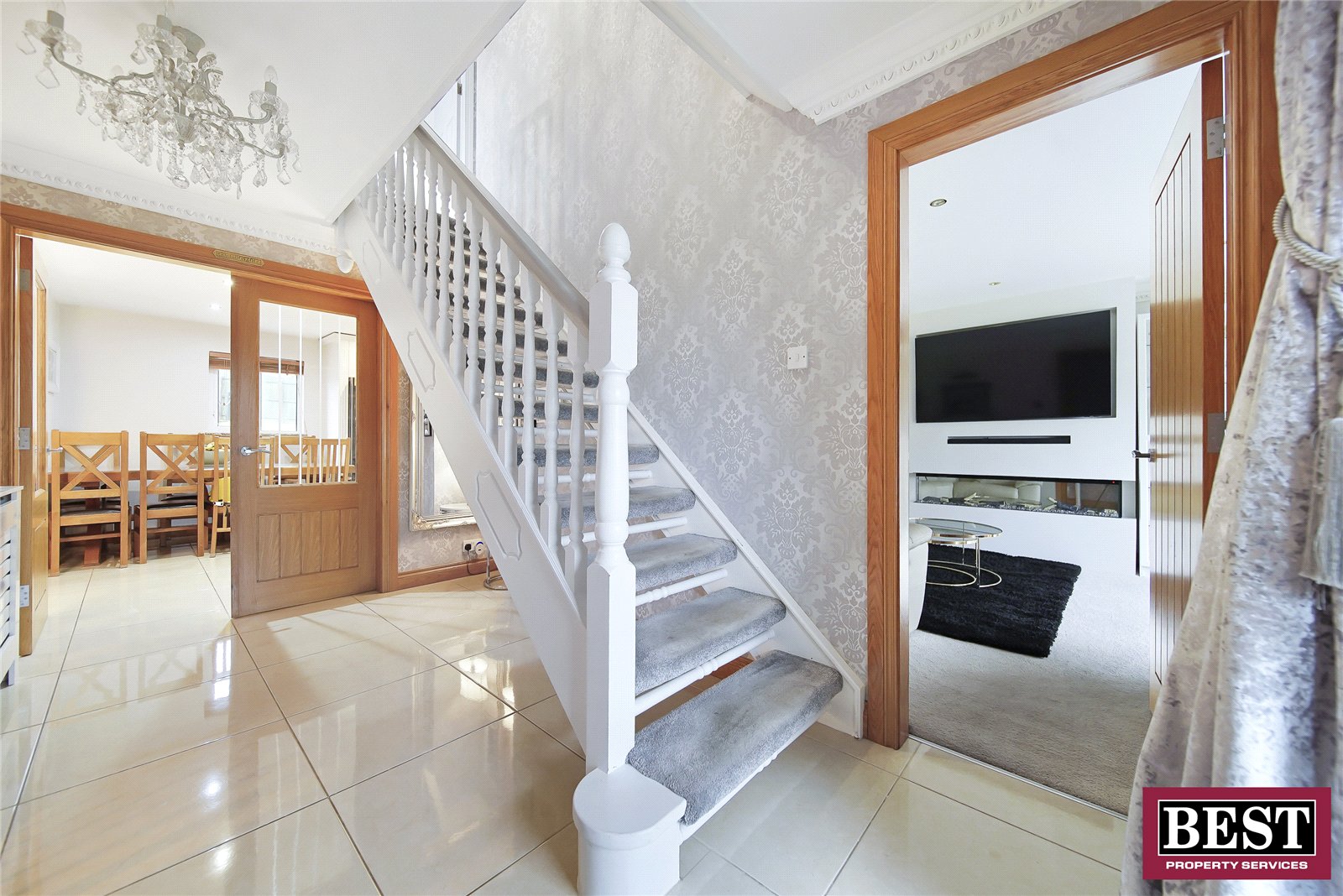 Tile flooring, wooden radiator cover, coving, double French doors to kitchen/dining area, wooden staircase.