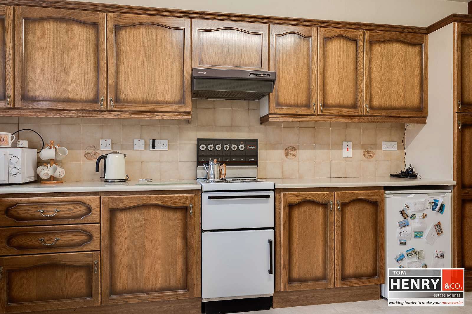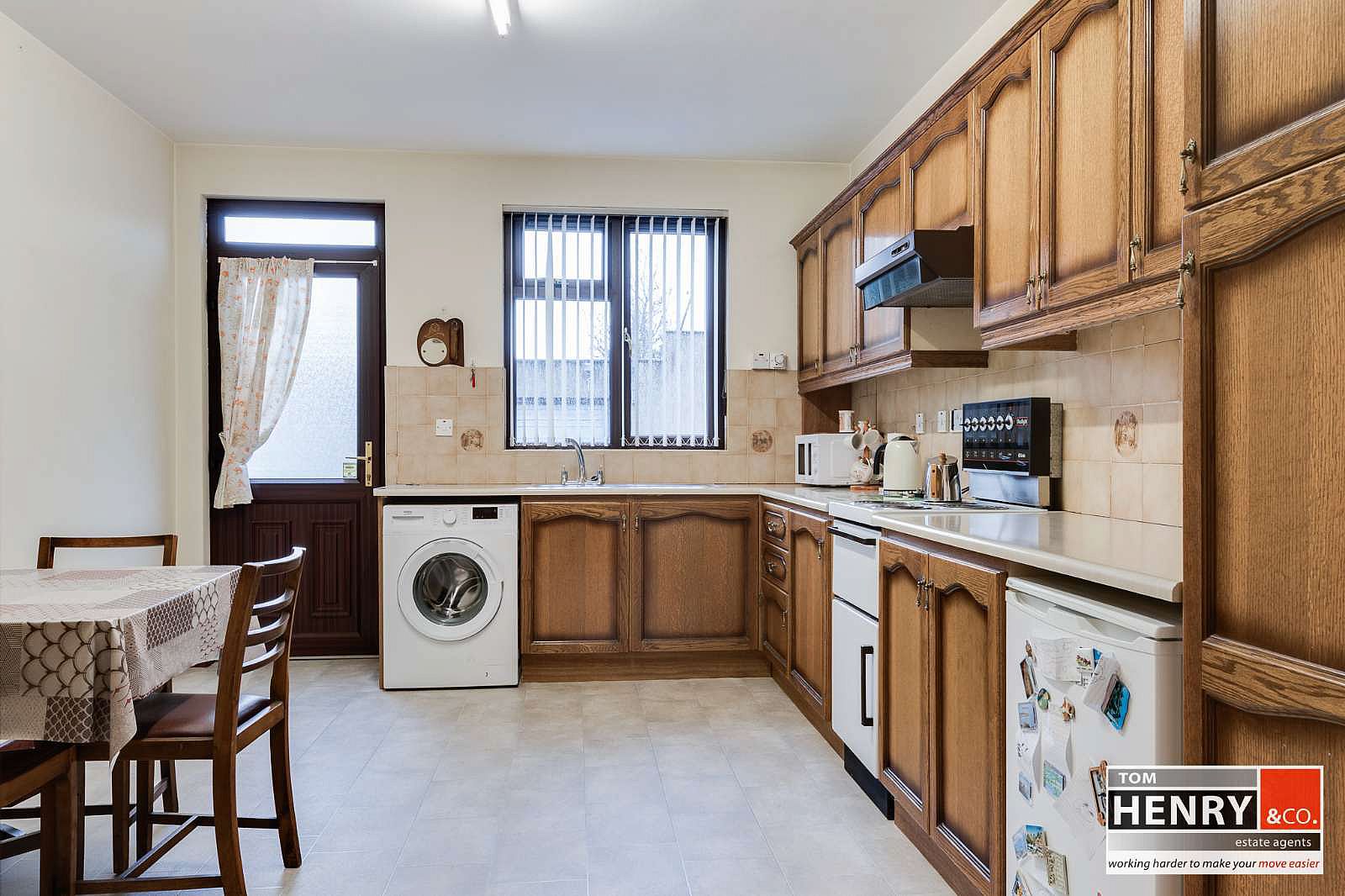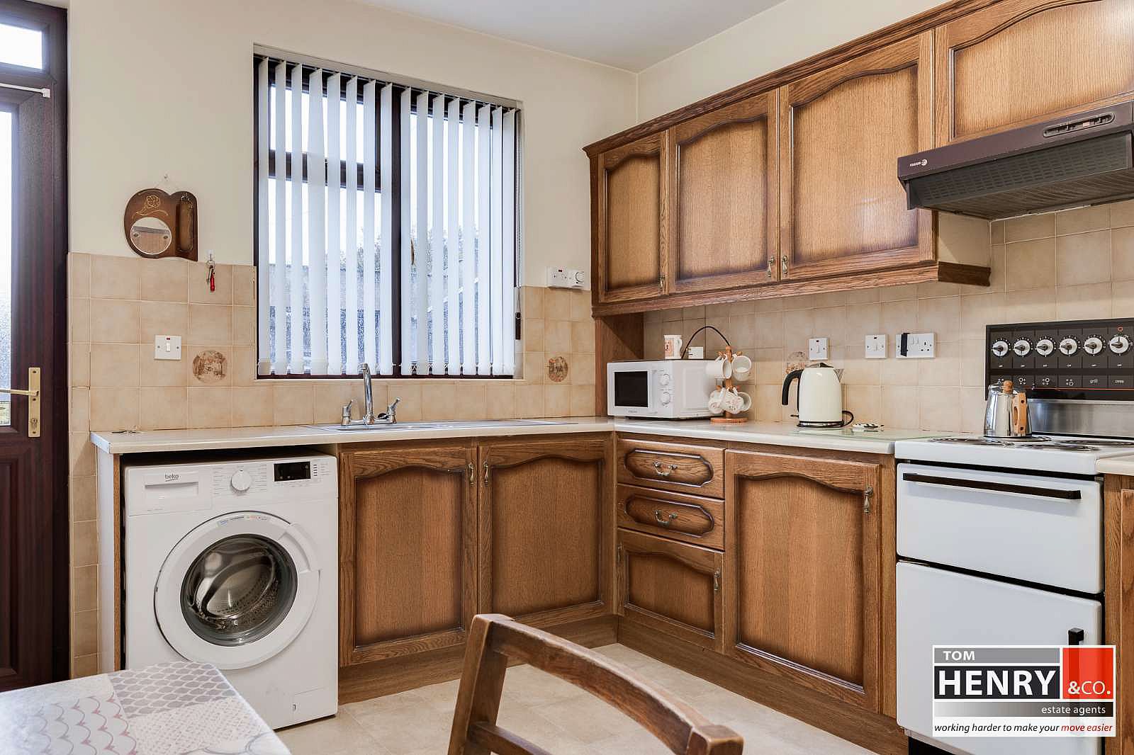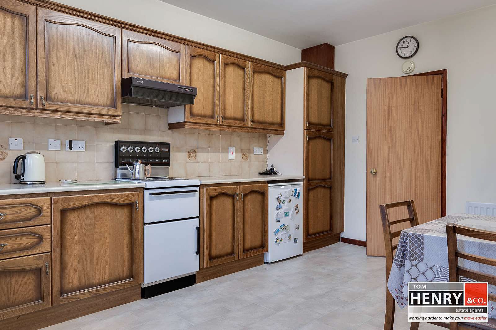 FITTED HIGH & LOW LEVEL UNITS. S.S. SINK & DRAINER WITH MIXER TAP FITTING. SPACE FOR COOKER WITH X-FAN OVER. SPACE FOR FRIDGE. PLUMBED FOR A.W.M. TILED BETWEEN UNITS. U.P.V.C. EXTERNAL DOOR WITH GLAZED TOP PANEL.
