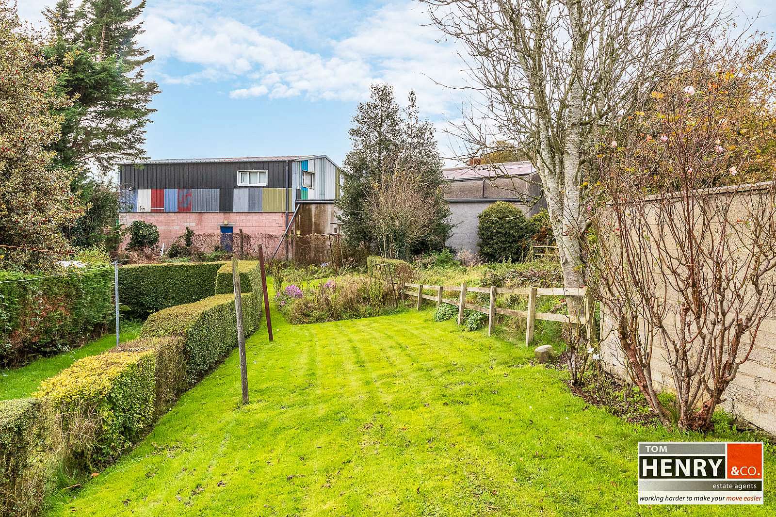 GENEROUS GARDEN LAID TO LAWN WITH SHRUB BEDS.