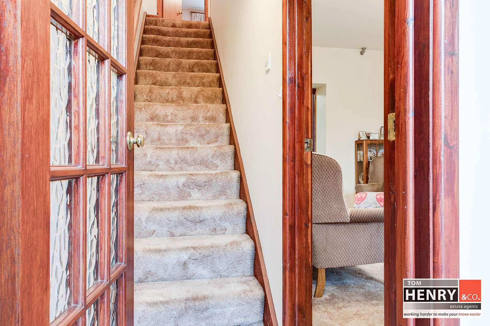 GEORGIAN GLAZED DOOR FROM ENTRANCE PORCH. CARPET TO FLOOR. CARPET TO STAIRS TO FIRST FLOOR.