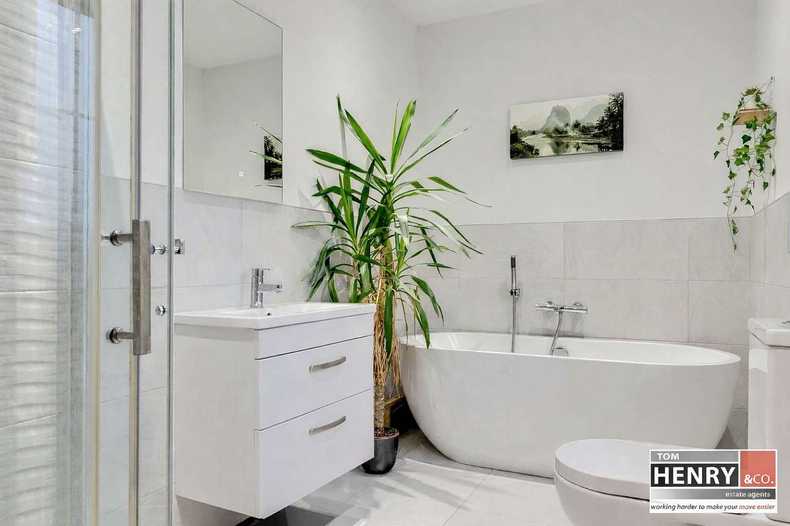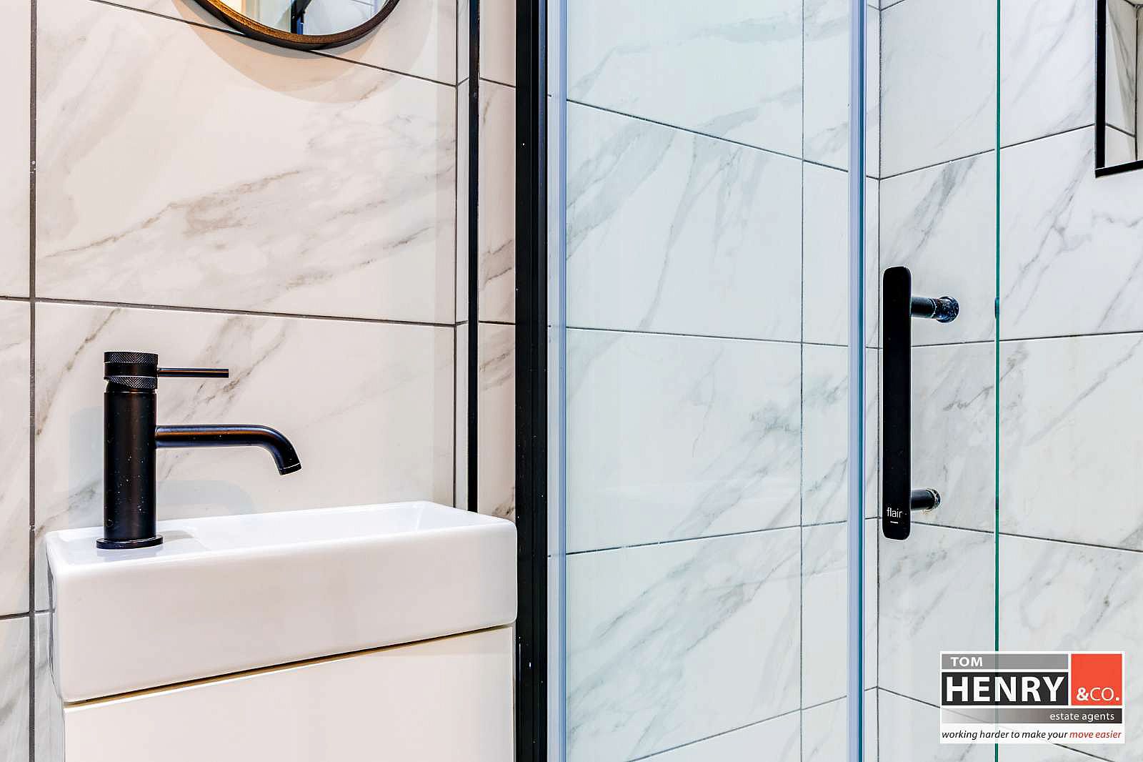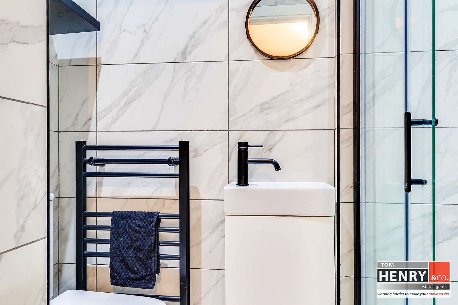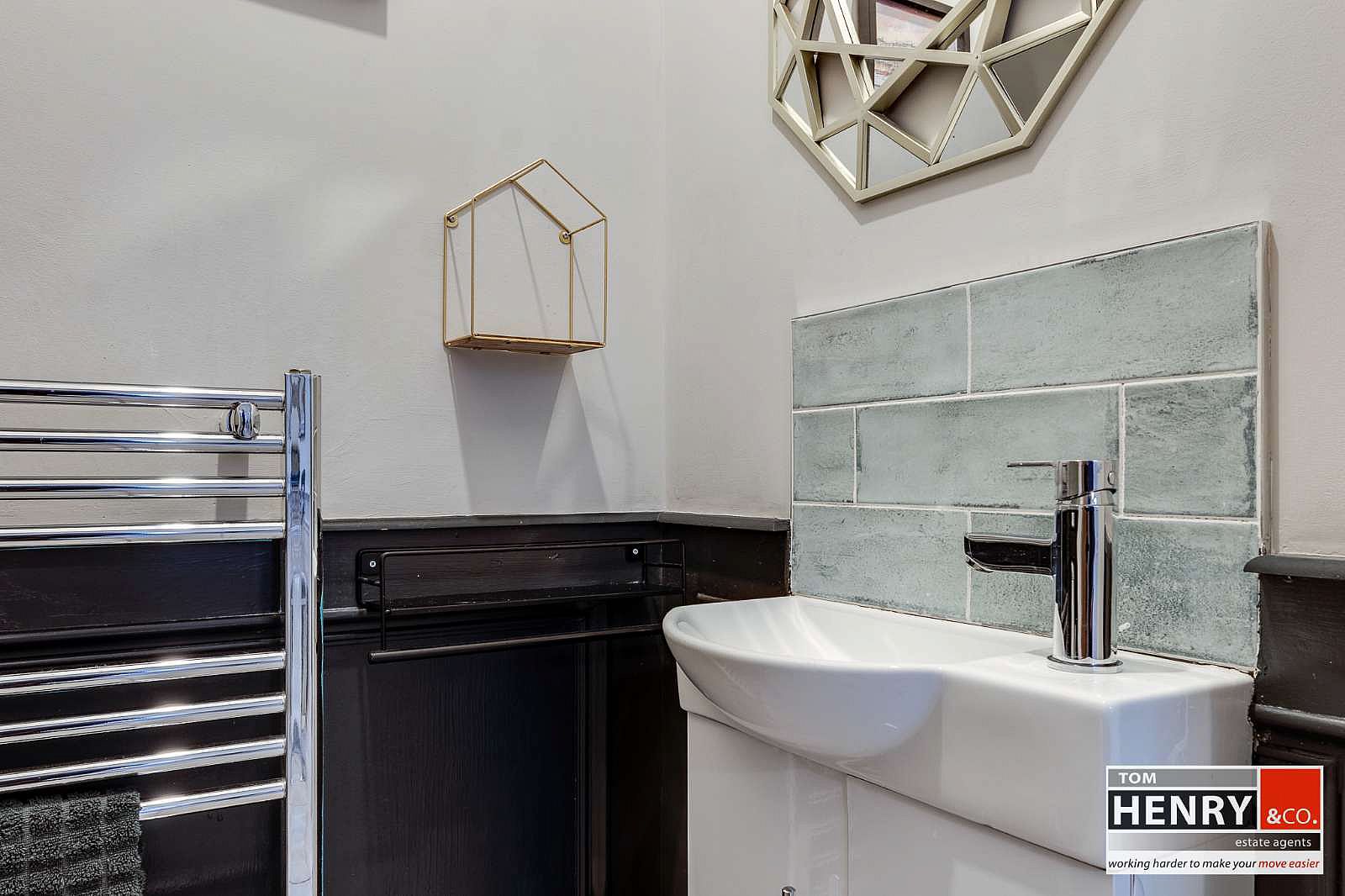 WASH HAND BASIN WITH MIXER TAP FITTING IN VANITY UNIT. TILED SPLASH BACK. FEATURE WALL PANELLING. HEATED TOWEL RAIL. TILED FLOOR. X-FAN.