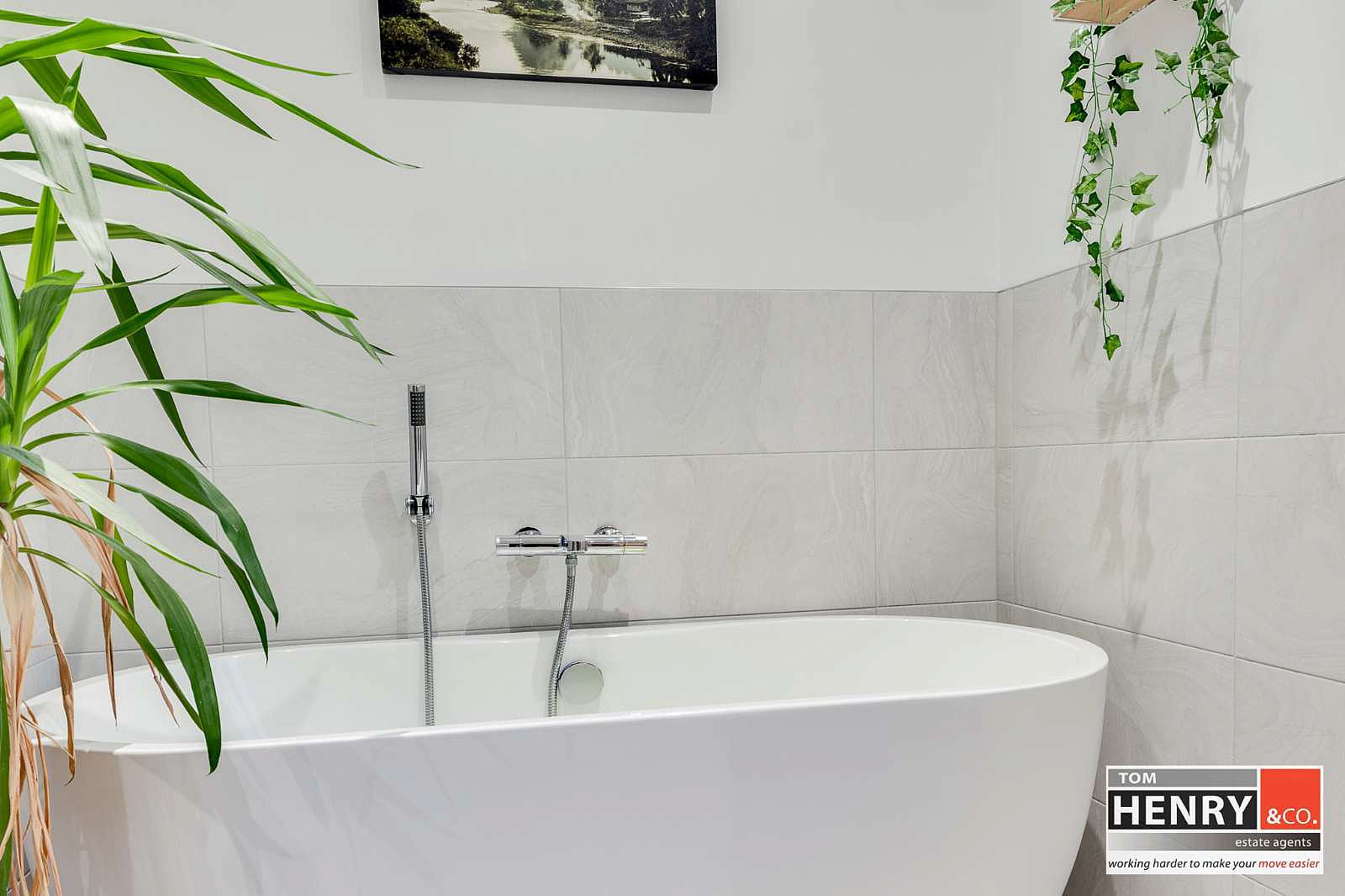 WASH HAND BASIN WITH MIXER TAP FITTING IN VANITY UNIT. FREESTANDING BATH WITH MIXER TAP SHOWER FITTING. FULLY TILED SHOWER WITH DUAL HEAD FITTING. TOILET. SOME WALL TILING. TILED FLOOR. HEATED TOWEL RAIL. X-FAN.