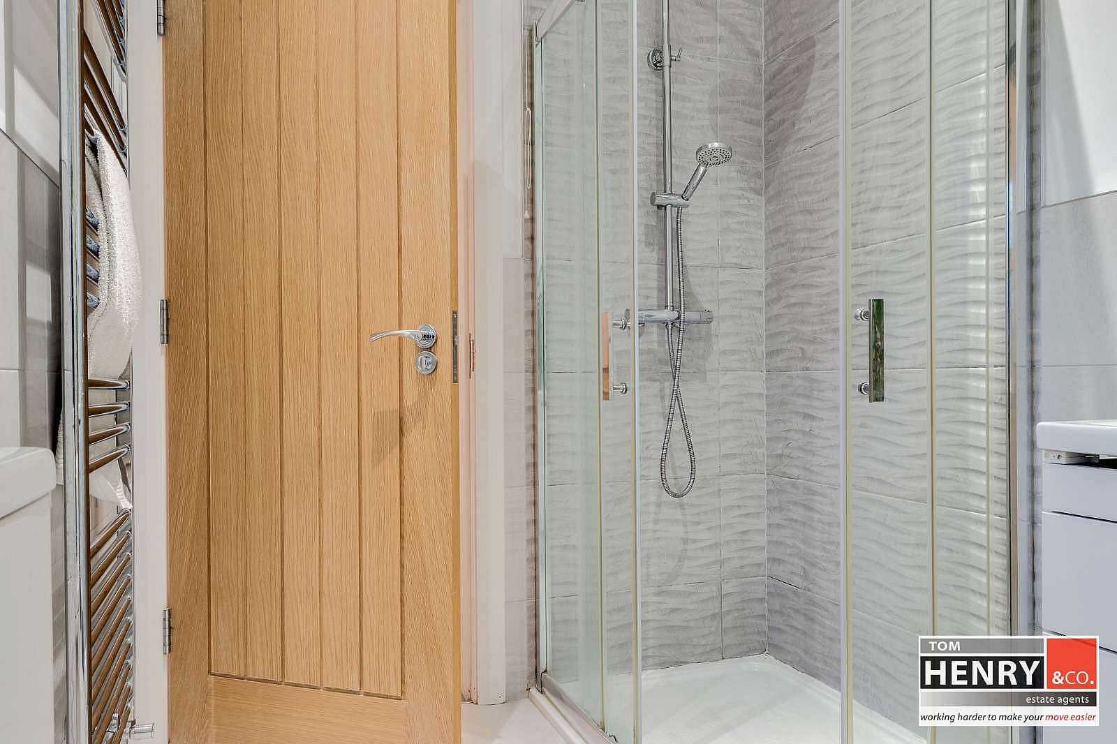 WASH HAND BASIN WITH MIXER TAP FITTING IN VANITY UNIT. SHOWER. TOILET. FULLY TILED WALLS. TILED FLOOR. HEATED TOWEL RAIL. X-FAN.