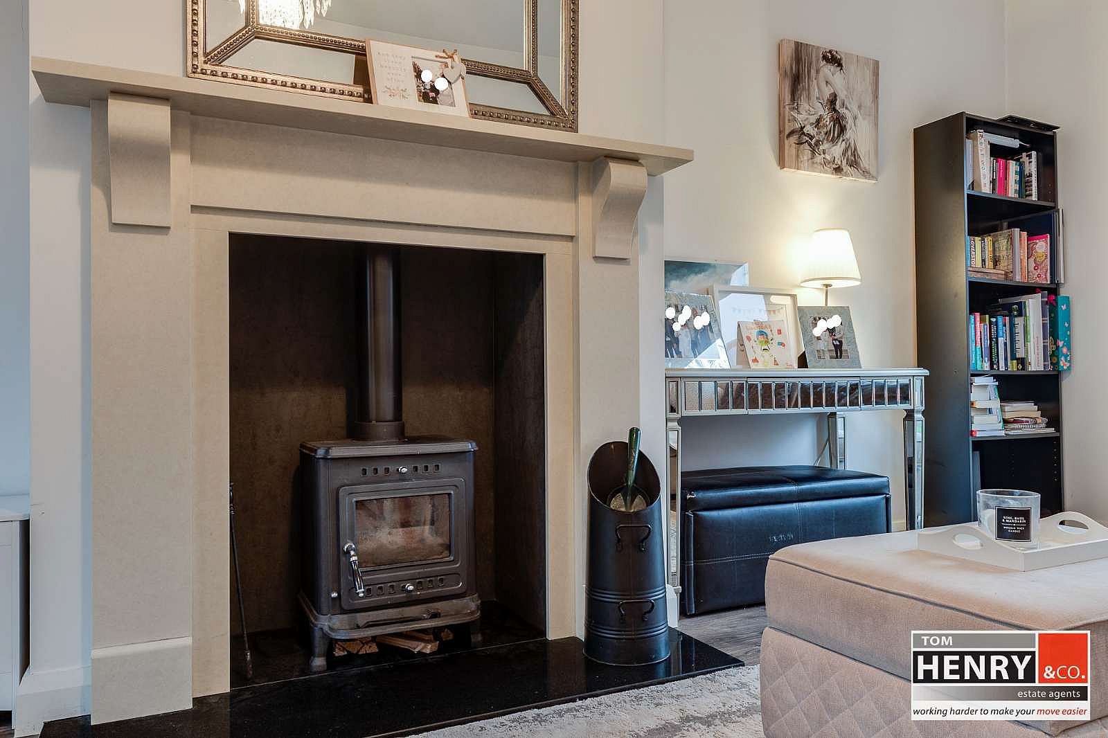 DUAL ASPECT TO FRONT & REAR. GLASS FRONTED STOVE IN INGLENOOK WITH STONE MANTLE & SURROUND. PRE-FINISHED FLOOR. GLAZED FRENCH DOORS TO PAVIA PATIO AREA / REAR GARDEN.