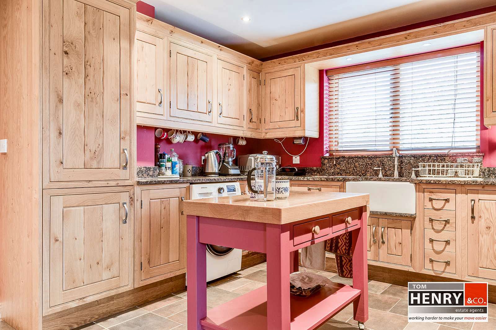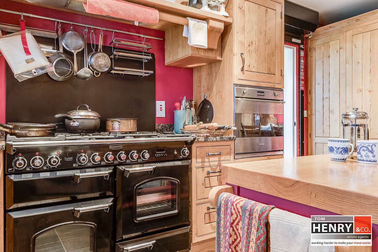 OAK IN-FRAME FITTED HIGH & LOW LEVEL UNITS. WINE & GLASS RACKING WITH DISPLAY SHELVING OVER BREAKFAST BAR. GRANITE WORK TOP & UPSTAND. LARDER TYPE UNITS. CERAMIC BELFAST STYLE SINK WITH MIXER TAP FITTING. RANGEMASTER GAS COOKER (INCLUDED). INTEGRATED EYE LEVEL OVEN. INTEGRATED FRIDGE FREEZER. INTEGRATED DISHWASHER. PLUMBED FOR A.W.M..TILED FLOOR. SHUTTER TYPE DOOR TO DINING ROOM / SUNROOM.