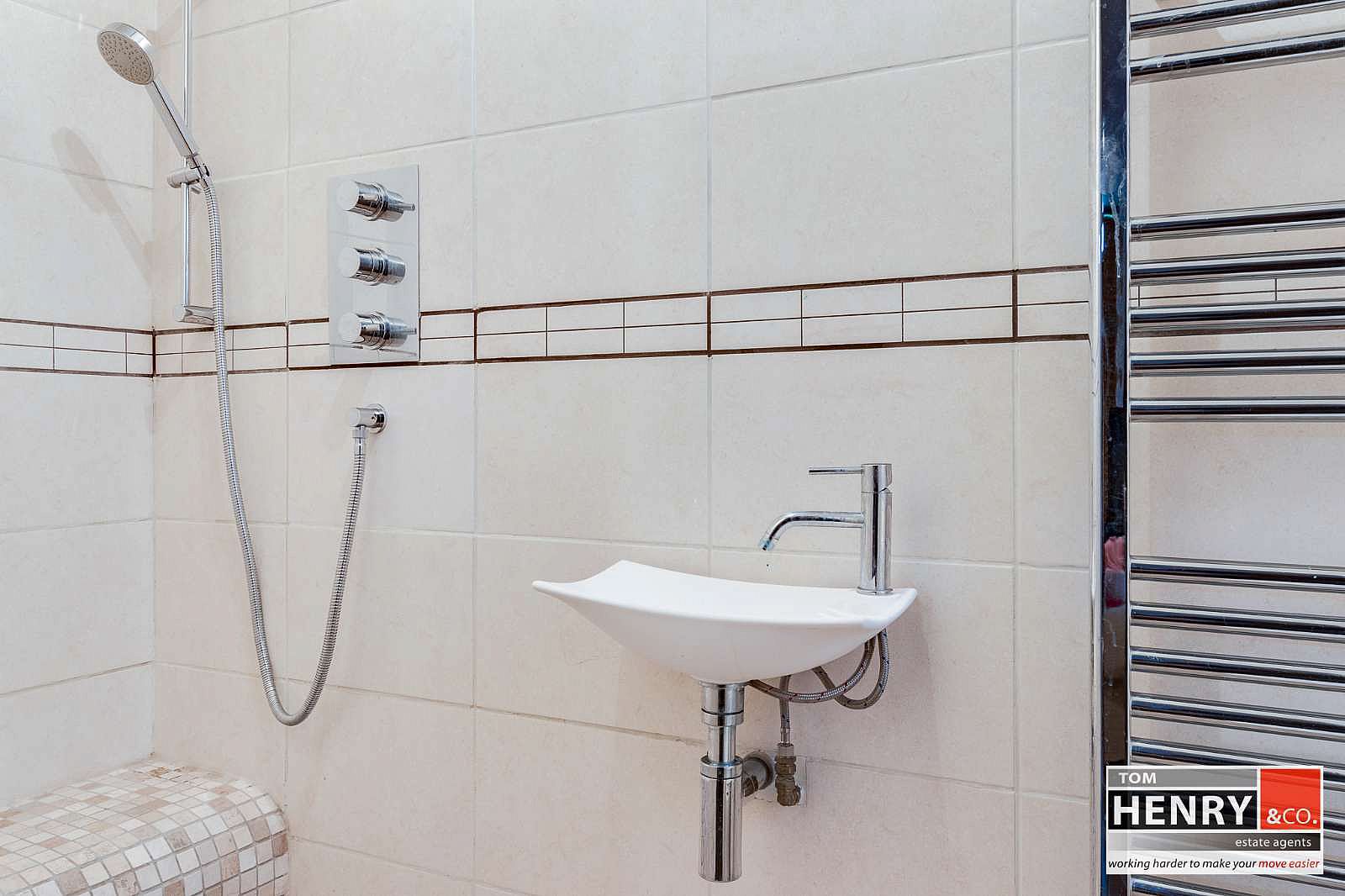 WET ROOM TYPE SHOWER. WASH HAND BASIN WITH MIXER TAP FITTING. TOILET. HEATED TOWEL RAIL. TILED WALLS & FLOOR. FEATURE STAINED GLASS WINDOW. X-FAN.