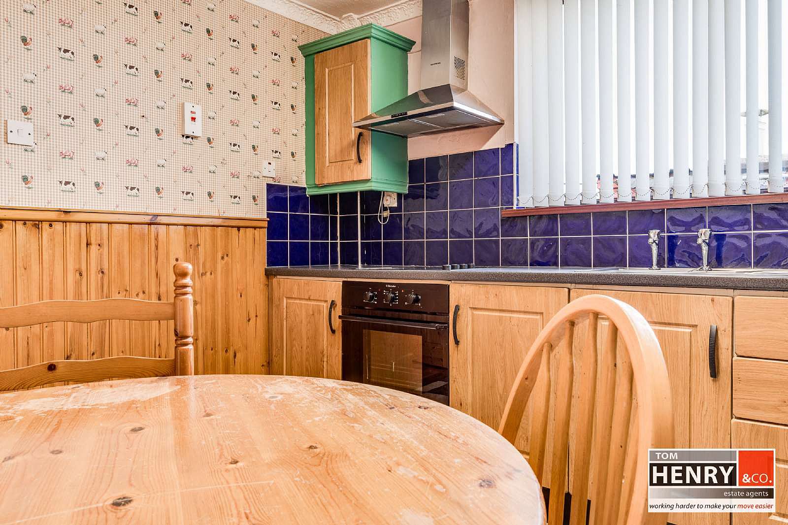 FITTED HIGH & LOW LEVEL UNITS. S. S. SINK & DRAINER. SPACE FOR FRIDGE FREEZER. HOB WITH X-FAN OVER IN S.S. CANOPY. INTEGRATED UNDER OVEN. TILED BETWEEN UNITS. TILED FLOOR. FEATURE WOODEN PANELLING TO WALLS. COVING TO CEILING.