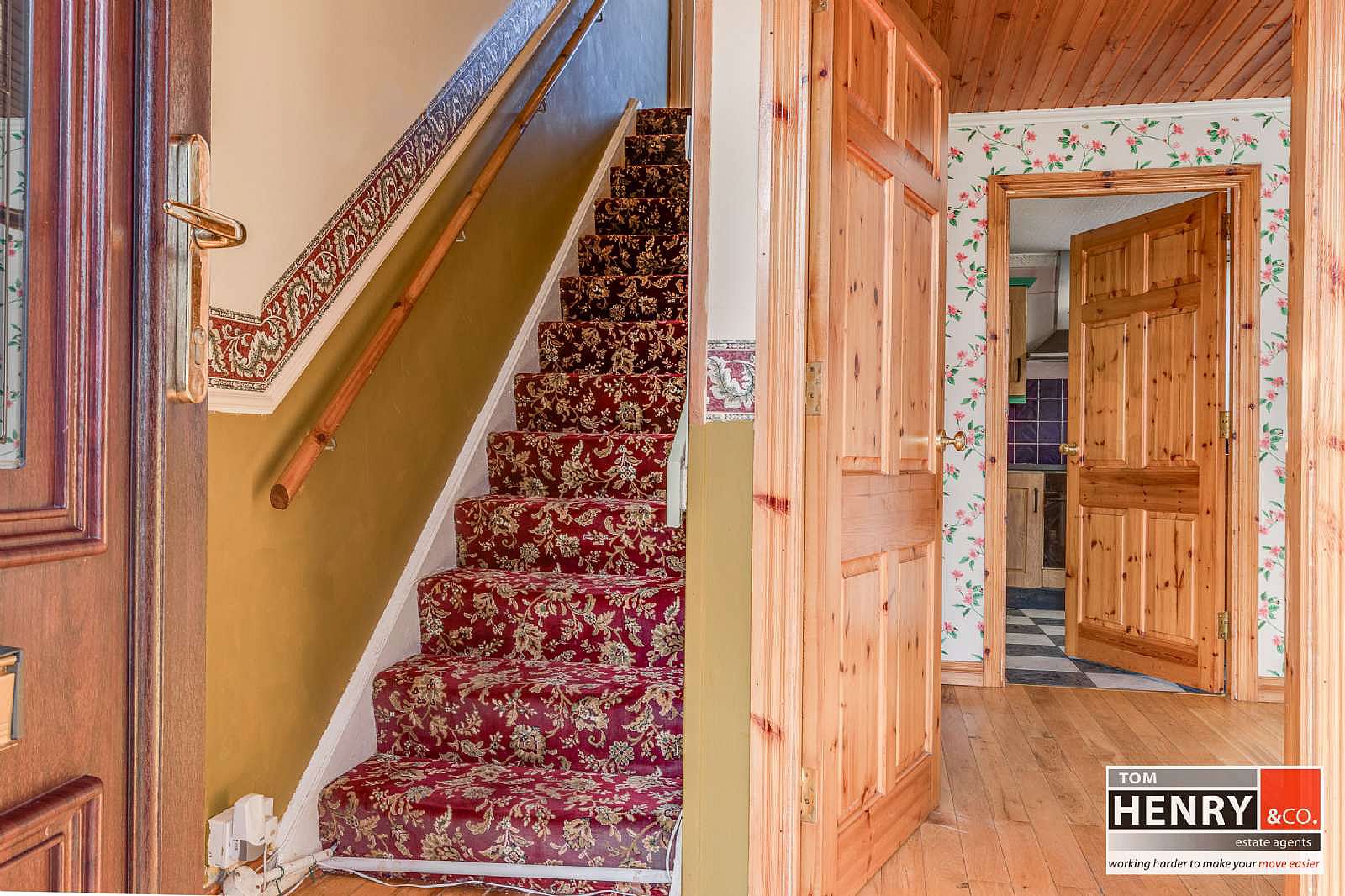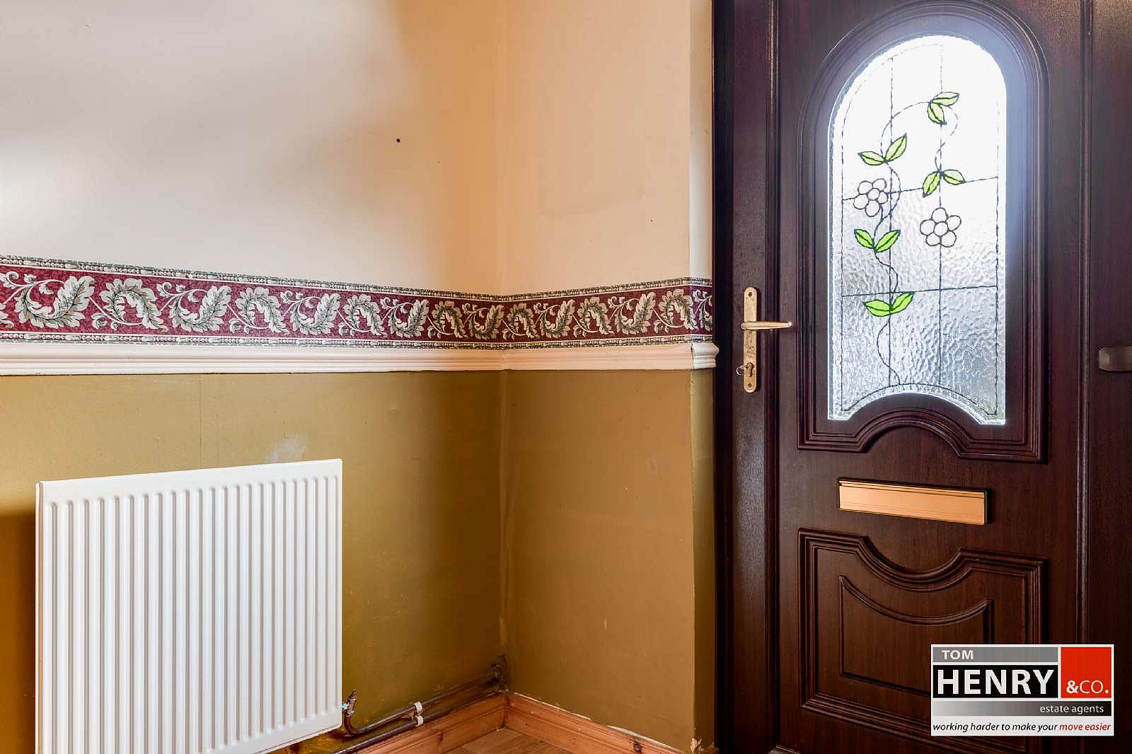 U.P.V.C EXTERNAL DOOR WITH LEADED GLASS PANEL & GLAZED TOP PANEL. PRE-FINISHED FLOOR. DADO RAIL. CARPET TO STAIRS TO FIRST FLOOR.