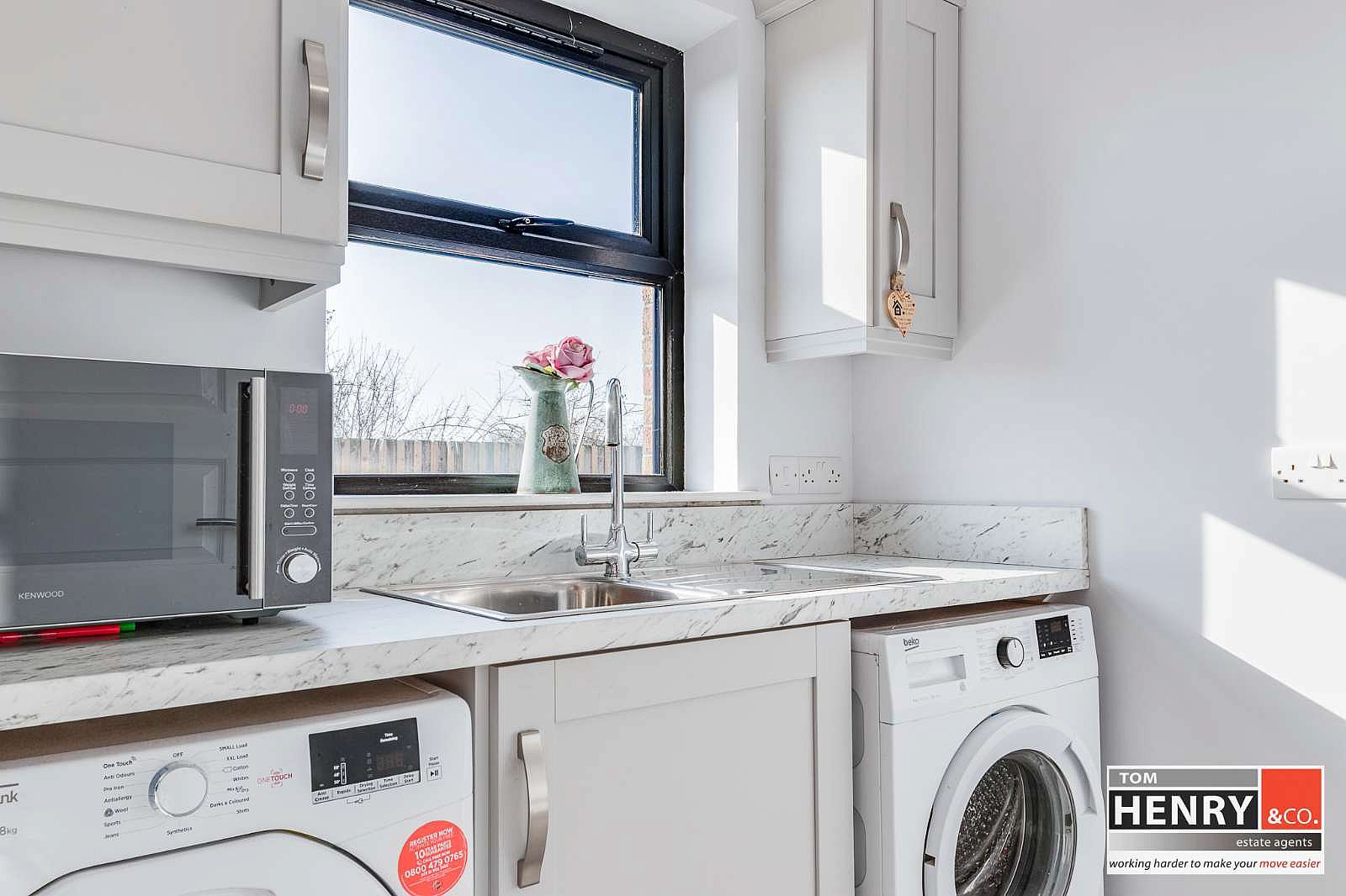 FITTED HIGH & LOW LEVEL UNITS. S.S. SINK & DRAINER WITH MIXER TAP FITTING. PLUMBED FOR WASHING MACHINE. SPACE FOR TUMBLE DRYER. TILED FLOOR.