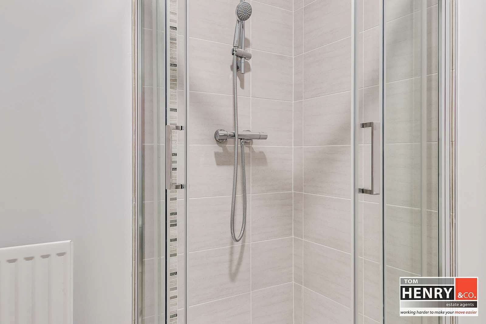 TILED THERMOSTATIC SHOWER. WASH HAND BASIN WITH MIXER TAP FITTING & TILED SPLASH BACK. TOILET, TILED FLOOR. X-FAN.