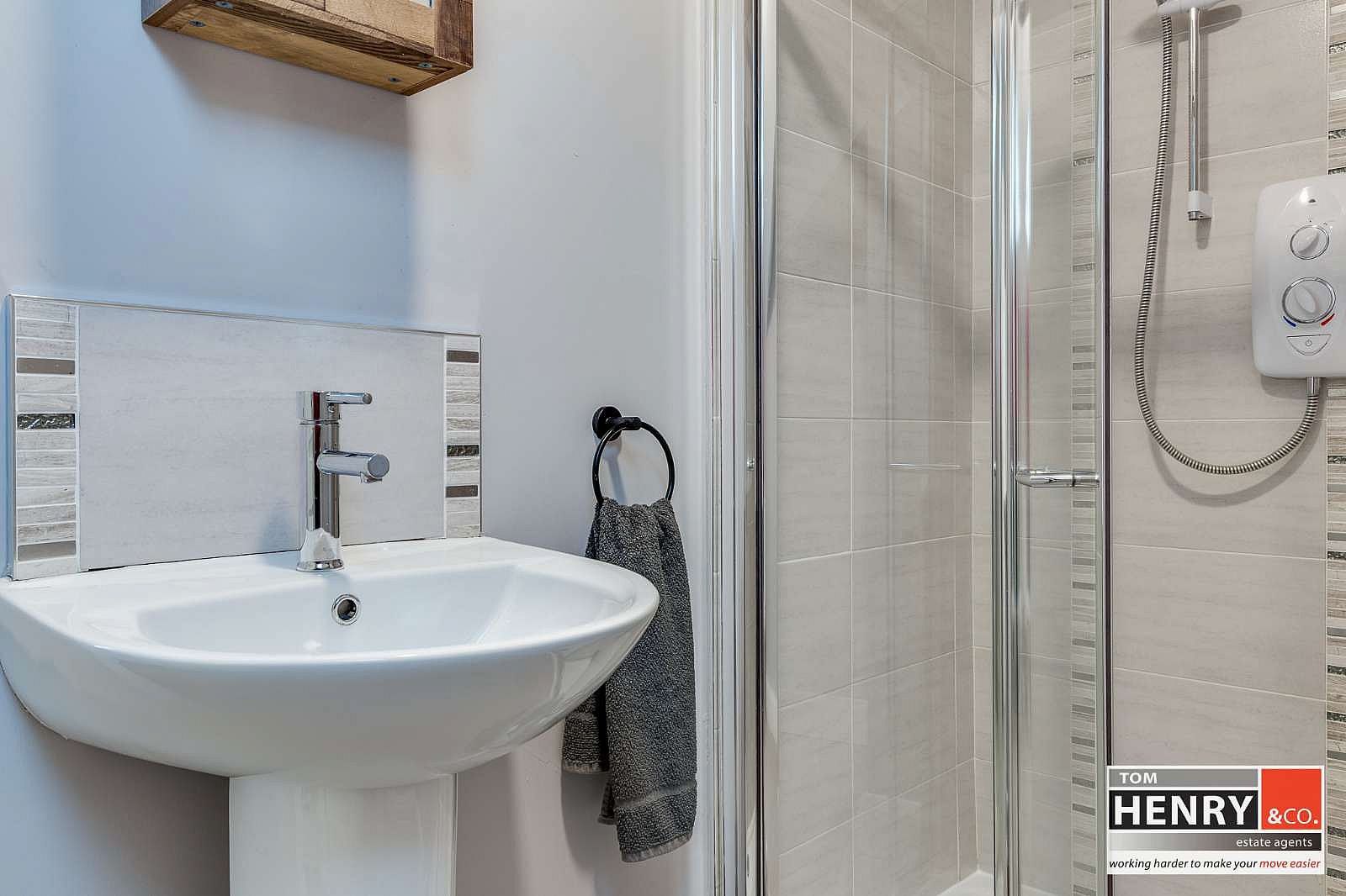 TILED ELECTRIC SHOWER. WASH HAND BASIN WITH MIXER TAP FITTING & TILED SPLASH BACK. TOILET. TILED FLOOR.