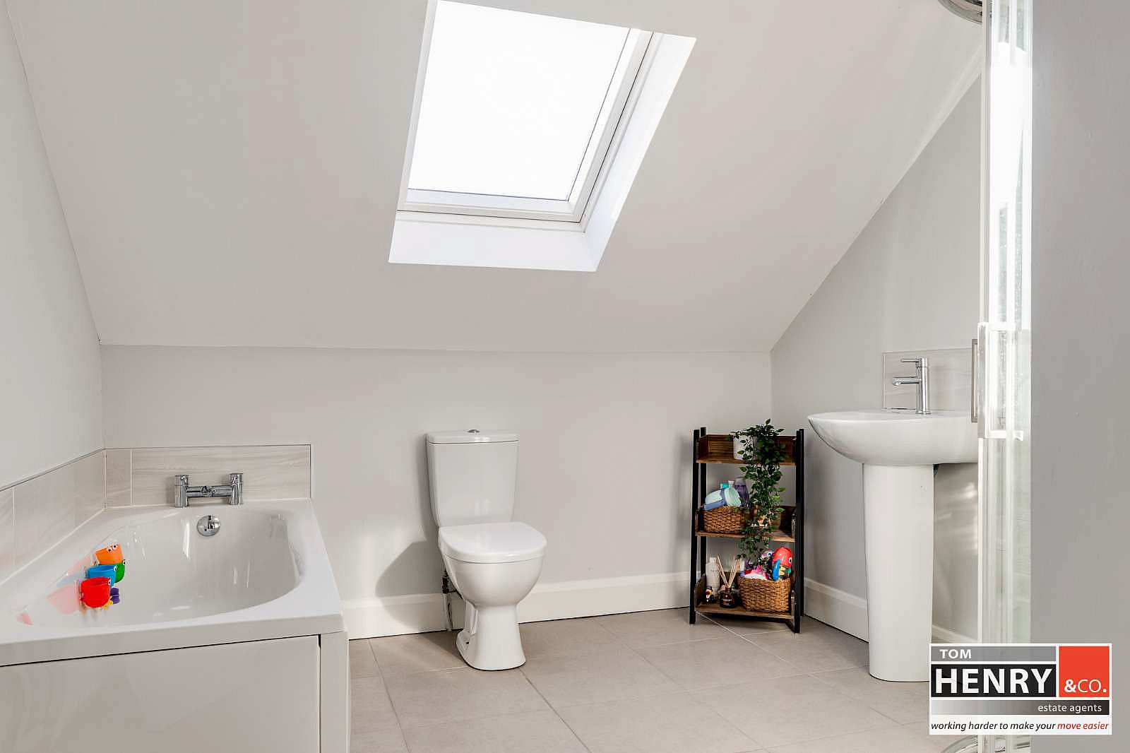 BATH WITH MIXER TAP FITTING & TILED SPLASH BACK. TILED THERMOSTATIC SHOWER. WASH HAND BASIN WITH MIXER TAP FITTING & TILED SPLASH BACK. TOILET. TILED FLOOR. X-FAN.