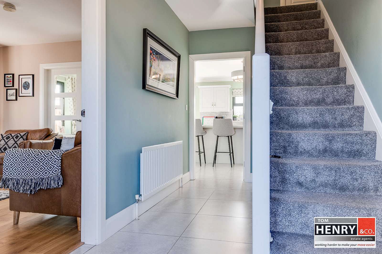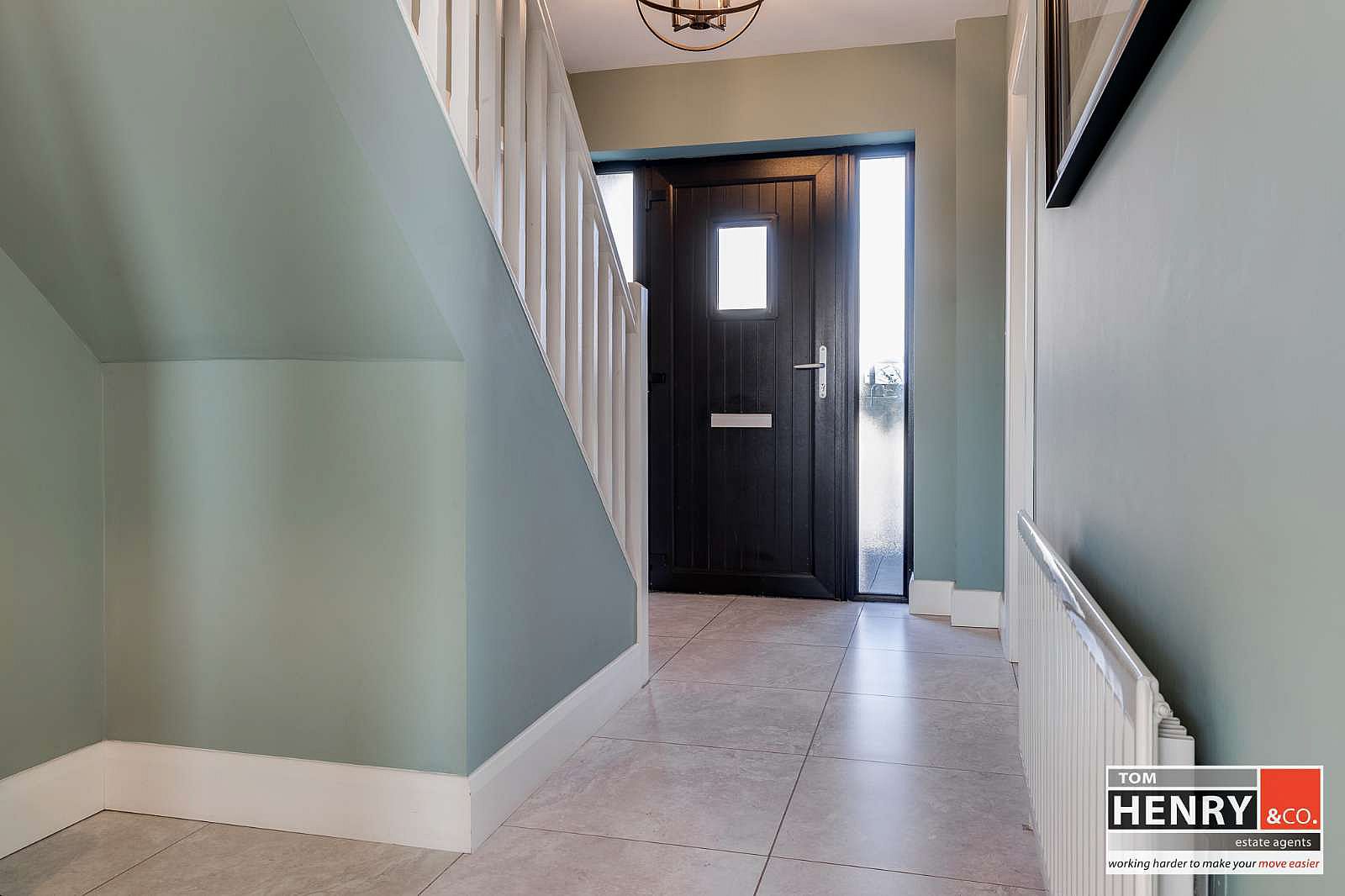 P.V.C. EXTERNAL DOOR WITH GLAZED PANEL & SIDE PANELS. TILED FLOOR. STAIRS TO FIRST FLOOR WITH CARPET.