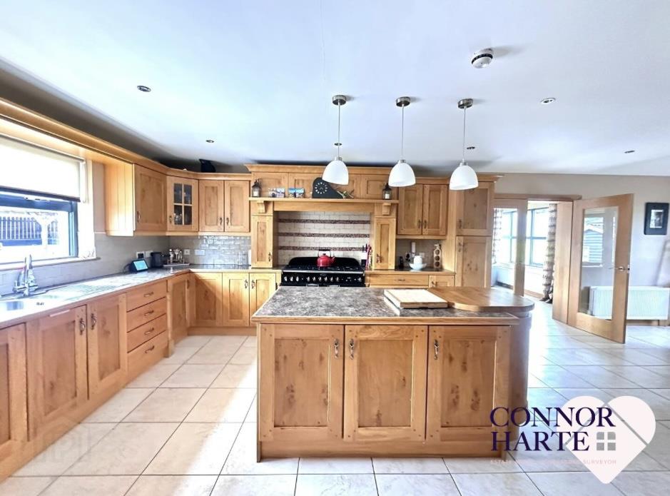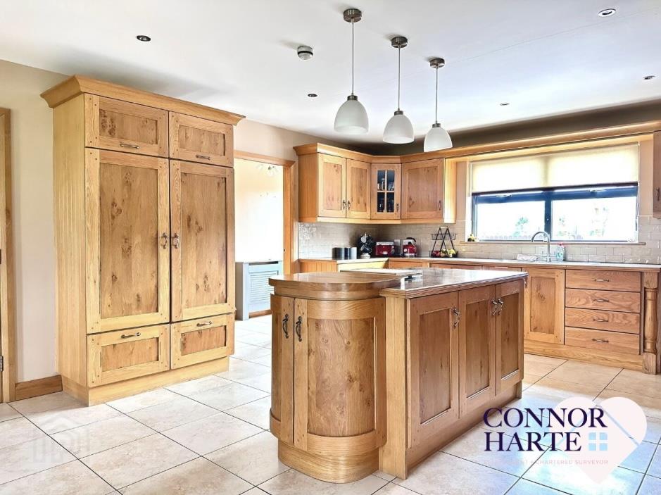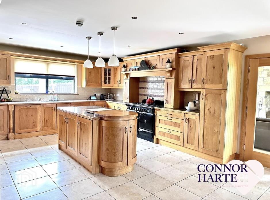 Handcrafted Oak cabinetry with high and low level units, matching over mantle with extractor fan and light. Tiled splash back behind cooker. Glazed display unit with spot lighting. Rangemaster cooker with 7 ring gas hob and electric ovens, grill and warming tray. 1 1/2 bowl stainless steel sink unit. Tiled floor and splash backs. Integrated dishwasher. Oak larder style unit with integrated fridge and freezer. Centre island with storage cupboard and butcher block. Pendant lighting over island. Spot lighting. Television and power points. Oak glazed French doors leading to sun room.