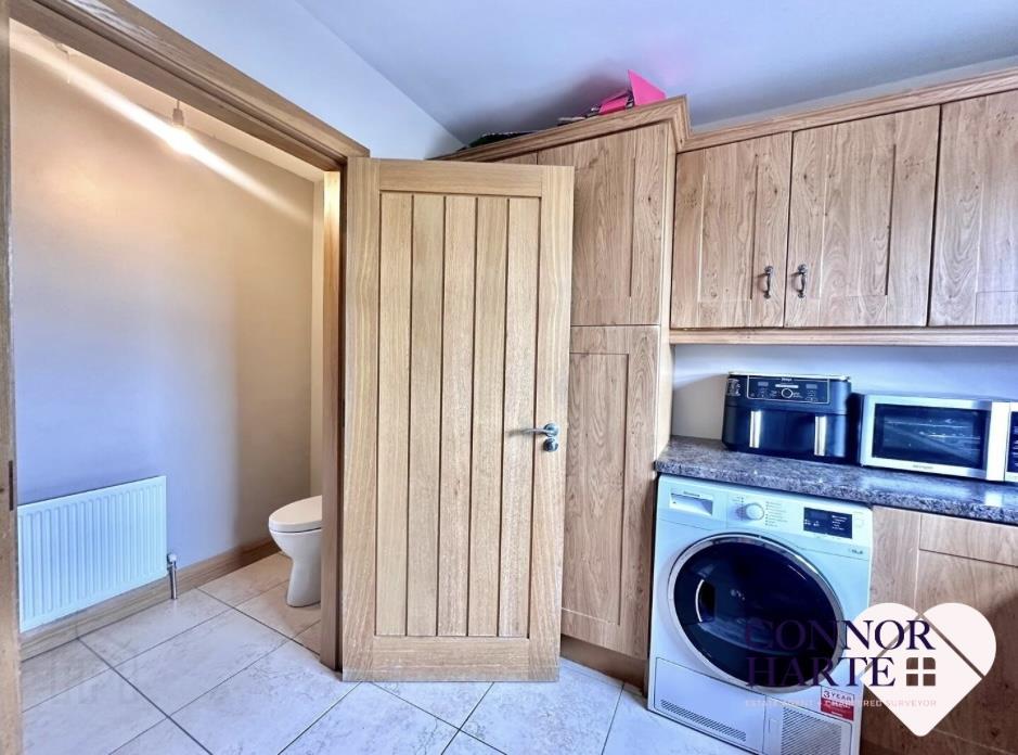 Excellent range of P.V.C Oak high and low level units. Single bowls stainless steel sink unit. Plumbed for automatic washing machine and space for tumble drer. Tiled floor and splash backs. Extractor fan and light.