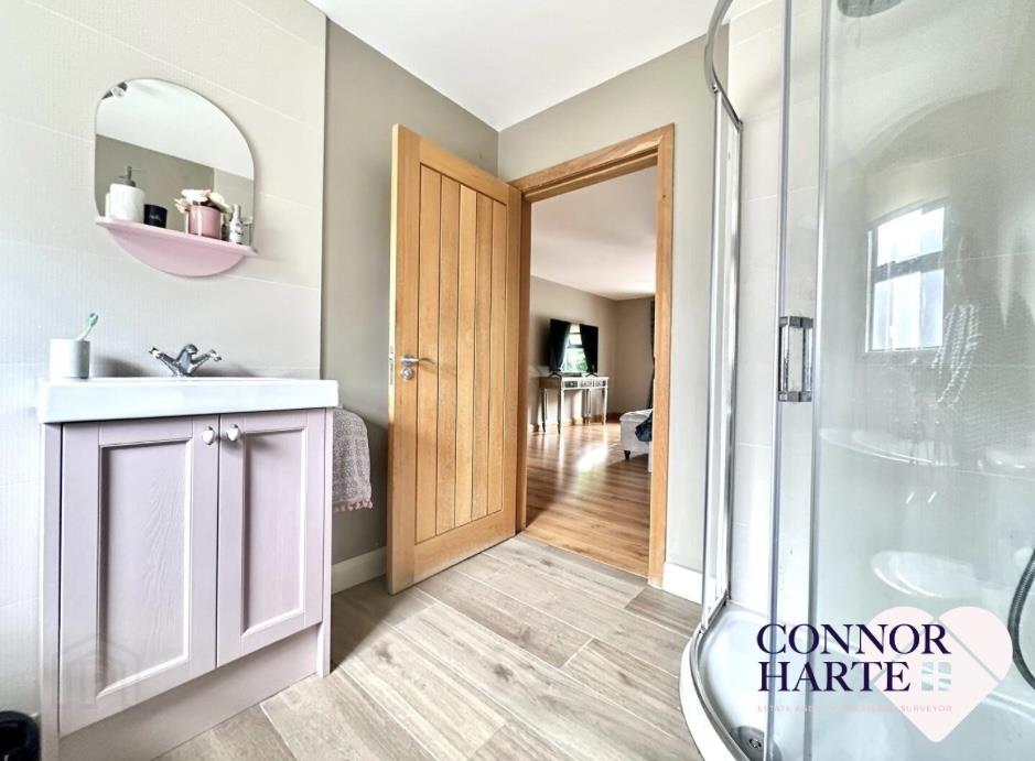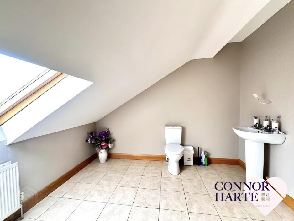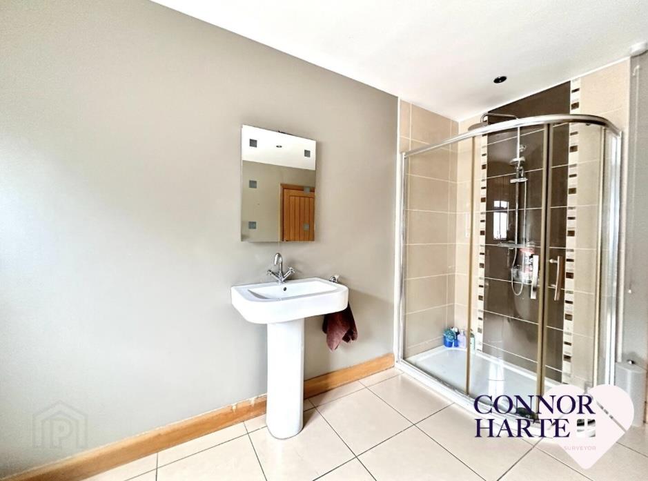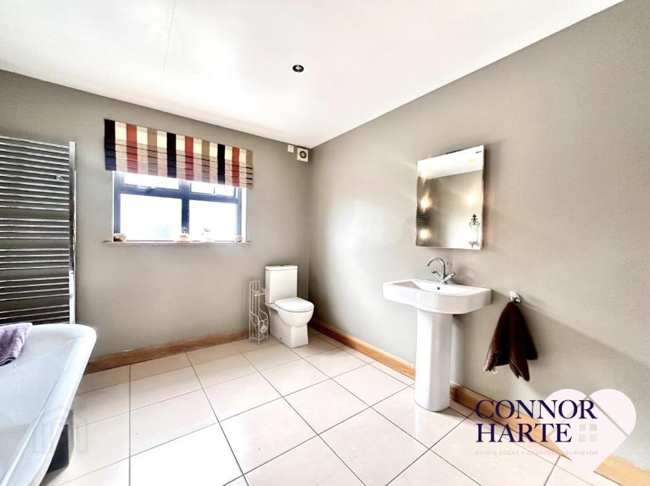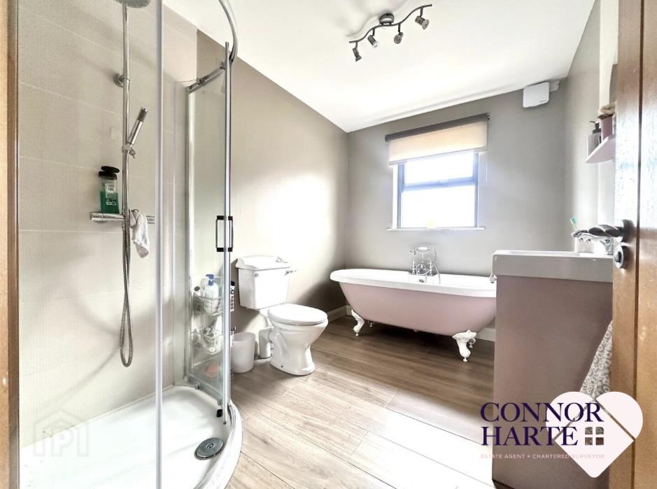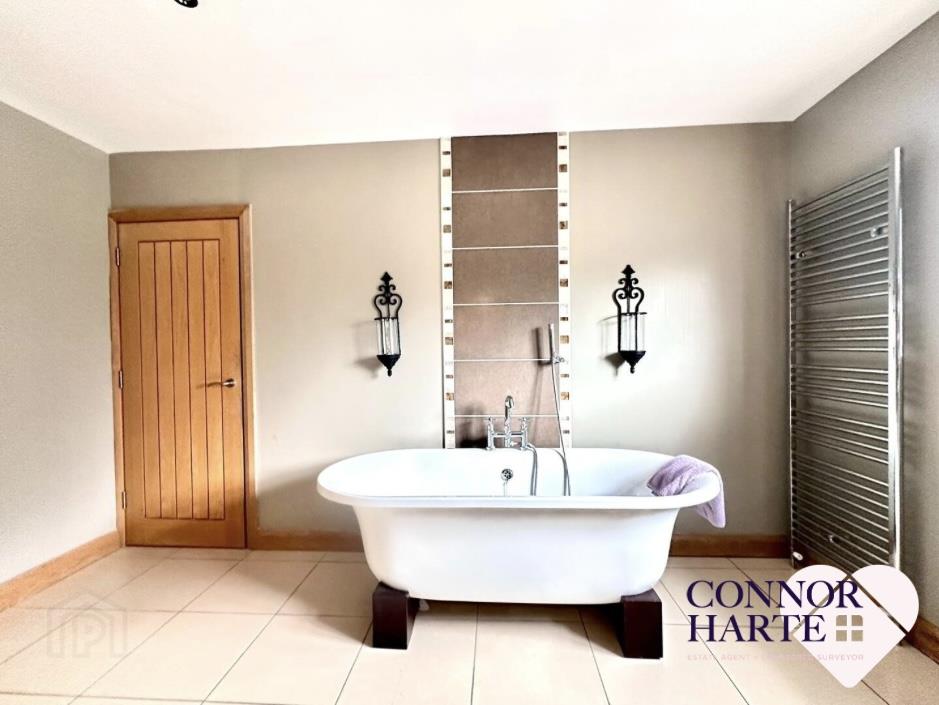 Contemporary white suite with chrome fittings. Low flush wc and pedestal wash hand basin. Freestanding double end bath on cradle stand. Feature wall to floor tiled splash back. Heated towel radiator. Quadrant shower enclosure, tiled with two head shower which includes rain fall shower head. Frameless modern wall mounted mirror with lights. Spot lighting. Extractor fan. Hotpress with light.