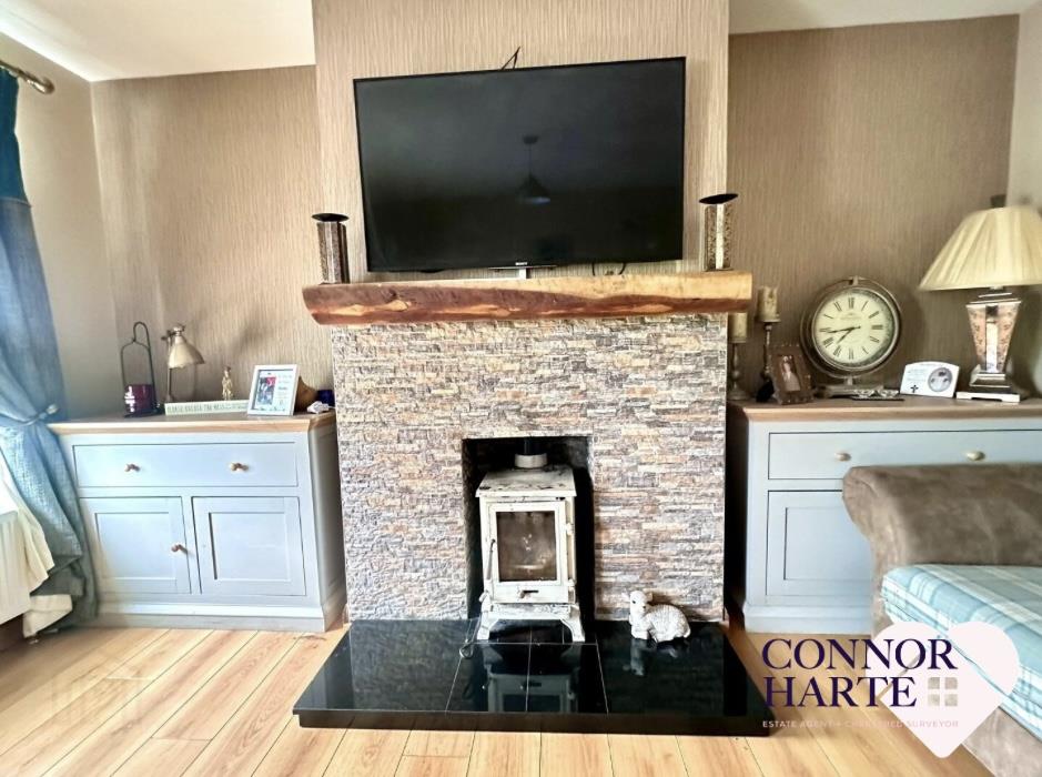 Family Room: 4.89m x 4.08m Wood burning stove with feature surround and railway sleeper mantle. Television and power points. Laminate wooden floor.