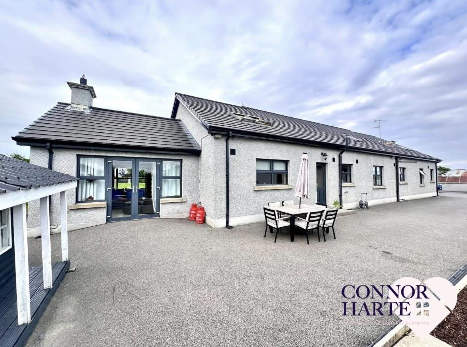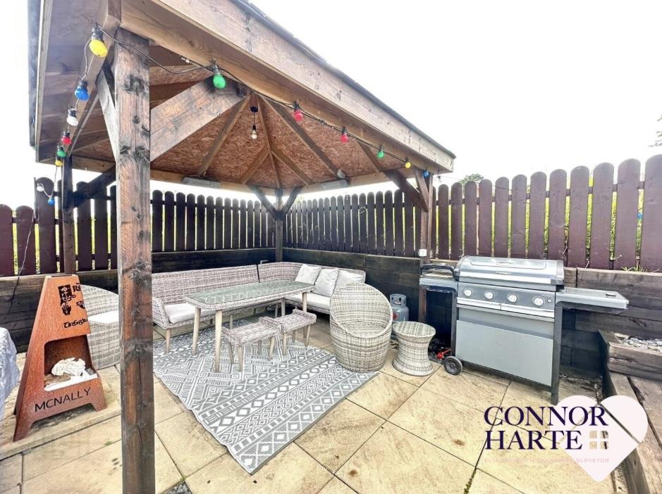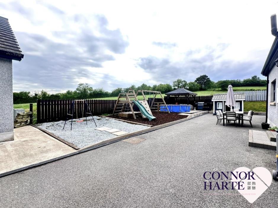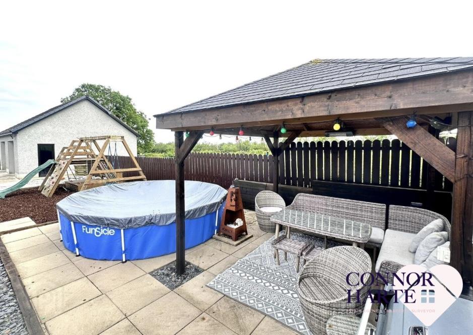 Double pillared entrance pillars leading to private residence. Sweeping tarmaced treelined driveway with extensive garden laid out in lawn. Stoned and barked kids play area. Outside water tap. Gardens to front laid out in lawn with privacy hedging and fencing. Garden to rear stoned and wood bark children's play area. Patio area with wood frame gazebo and tiled roof. Power points. Flagged area.