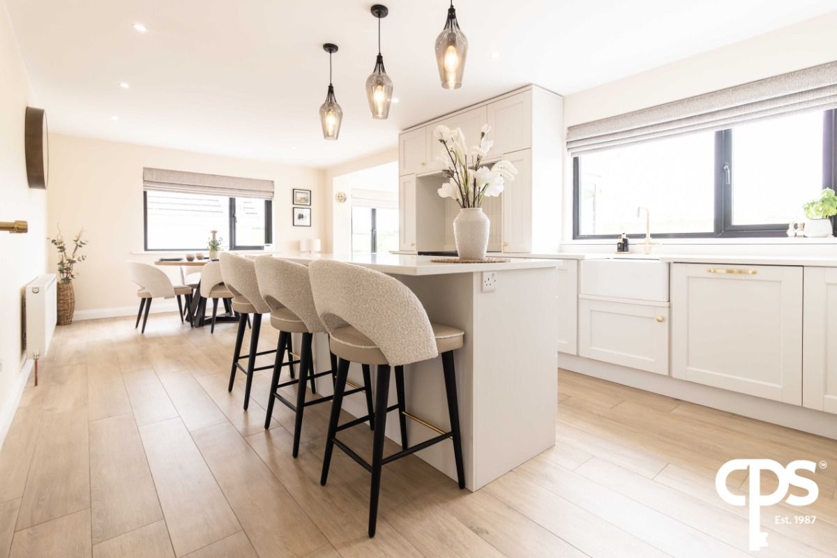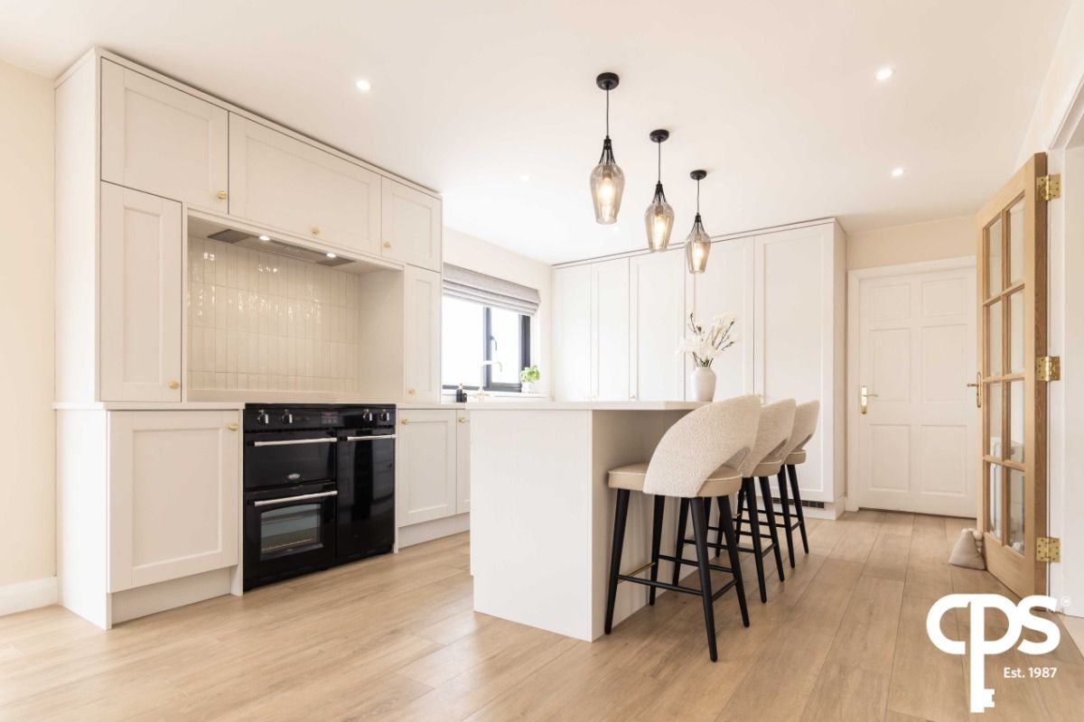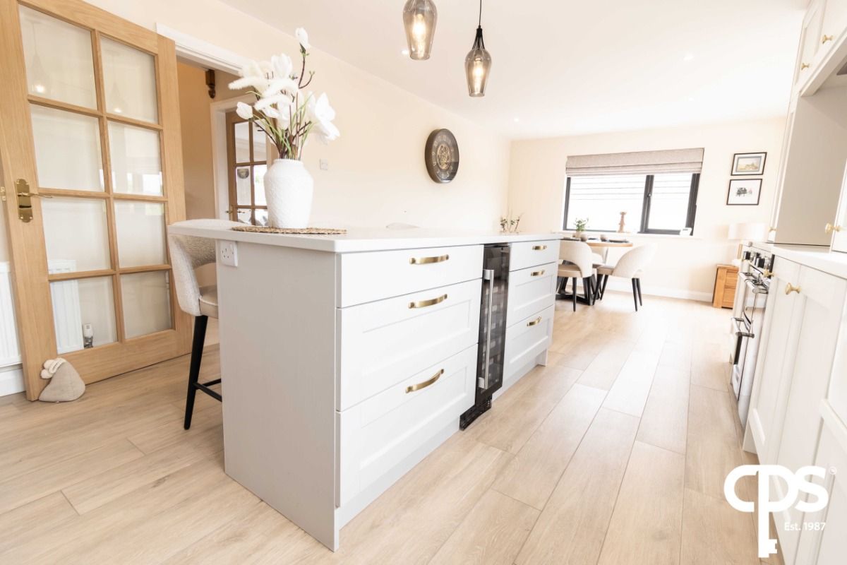 This stunning kitchen and dining area has had a full refurbishment only a year ago. The kitchen and dining area is very spacious, with tasteful high and low units allowing for ample storage. The flooring features stunning porcelain wood effect tiles that complement the kitchen perfectly .The kitchen allows for access to both the sun room and to the utility room. The fixtures include a belling hob and oven with built in hidden extractor fan, two double panel radiators, integrated dishwasher and a double Belfast style sink. An island has been added to allow more storage space options and has been fitted with a wine cooler for all your kitchen needs. Both kitchen work tops and island work tops have been finished with granite.