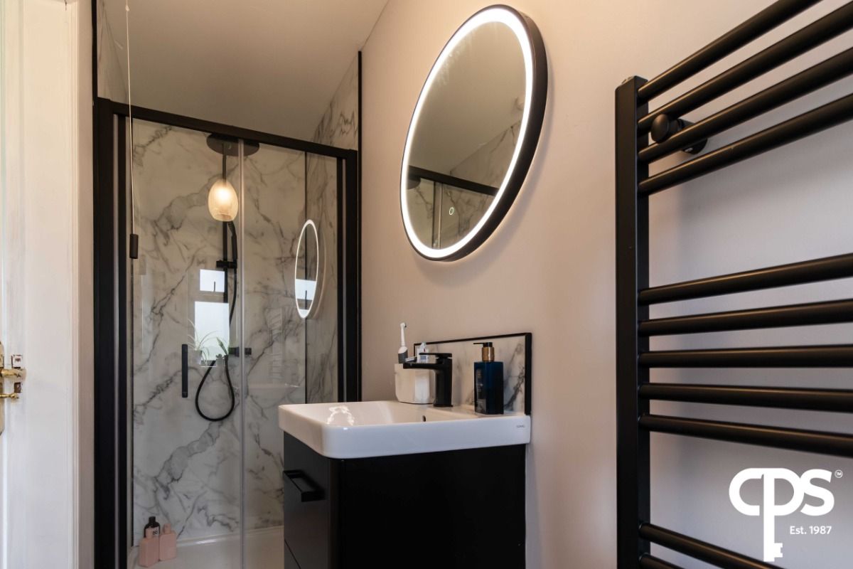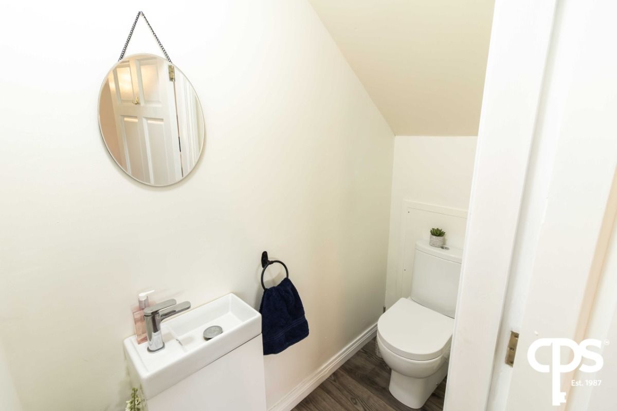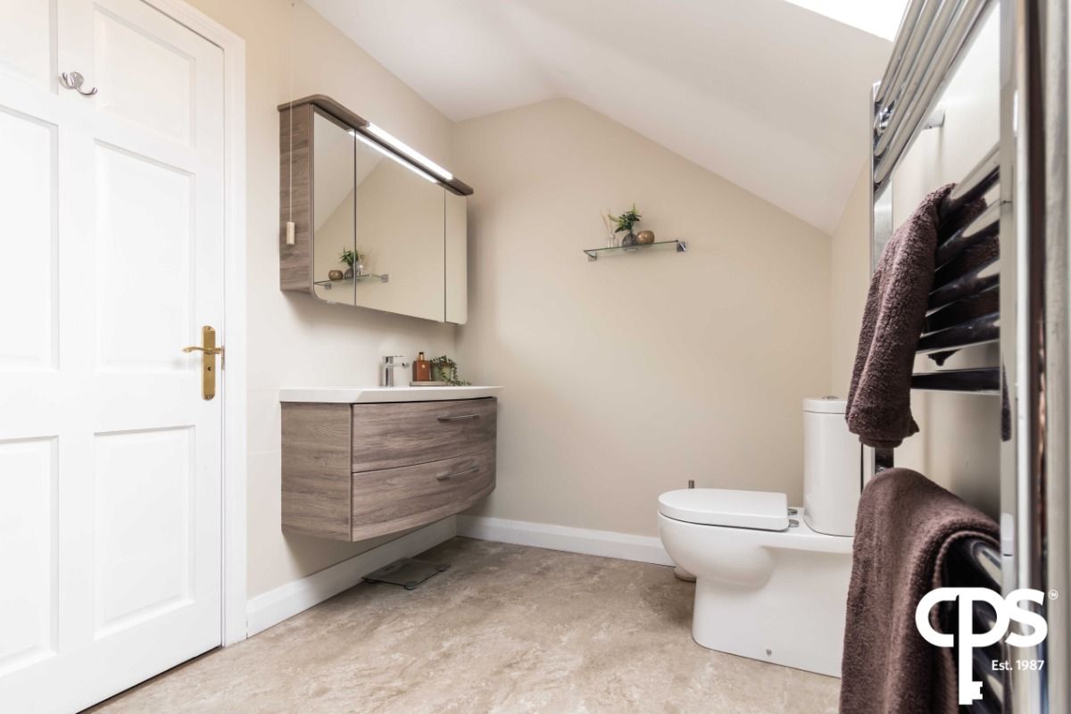 This three-piece upstairs shower room suite comprises of a WC, floating vanity unit with wash hand basin and a shower. The room benefits from laminate floors with the shower area finished in shower panelling that complements the room perfectly. Room also benefits from a wall mounted towel radiator. Room also benefits from an LED mirror.