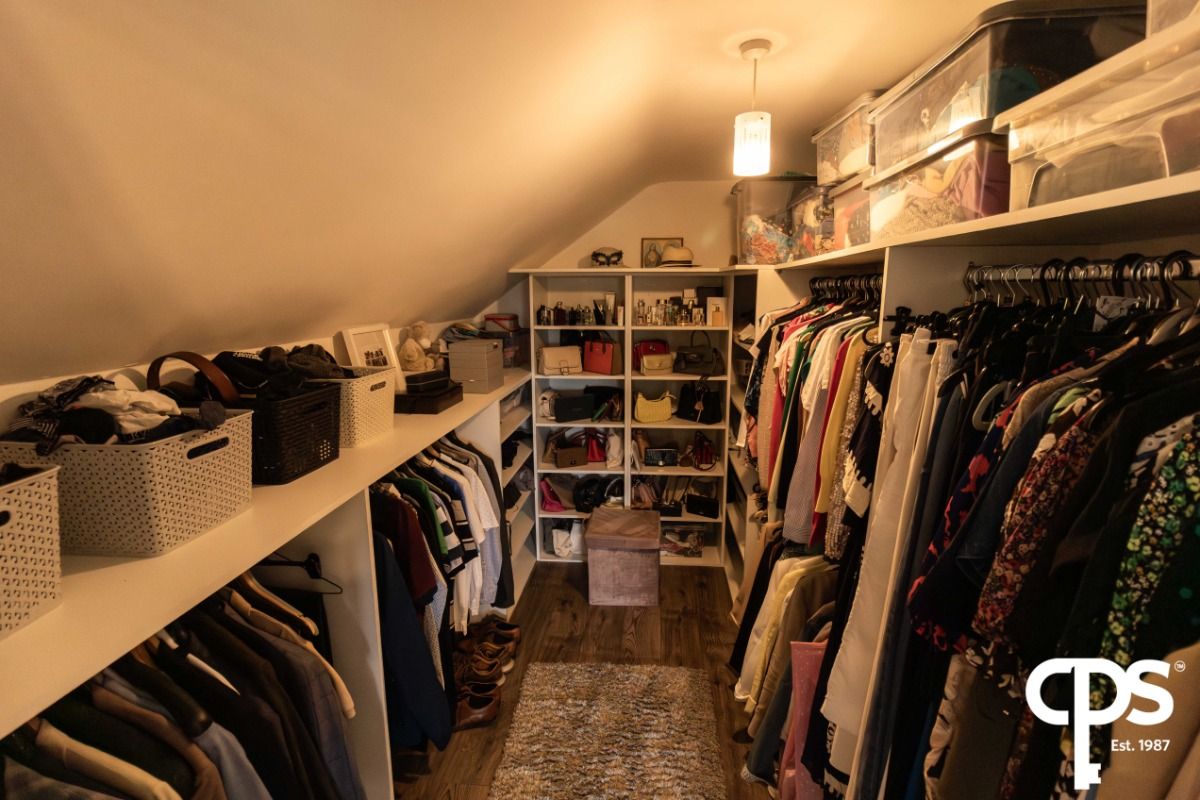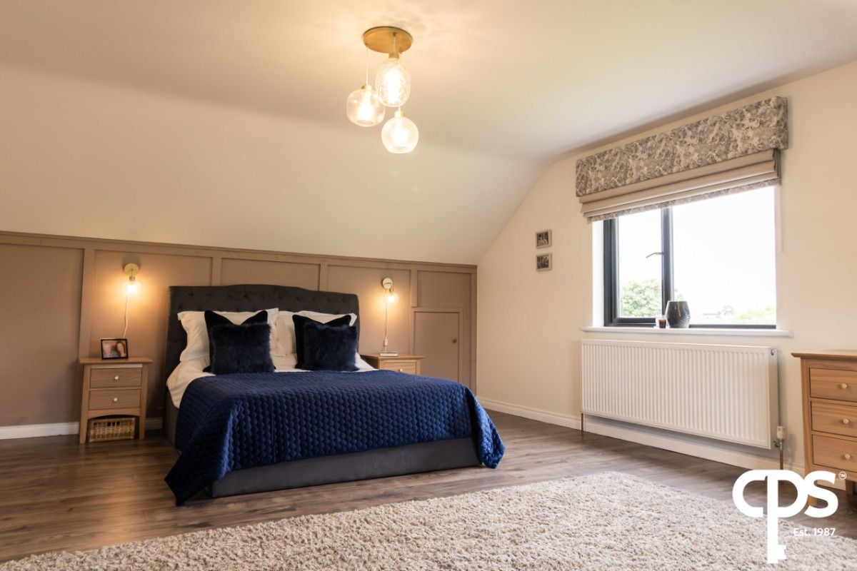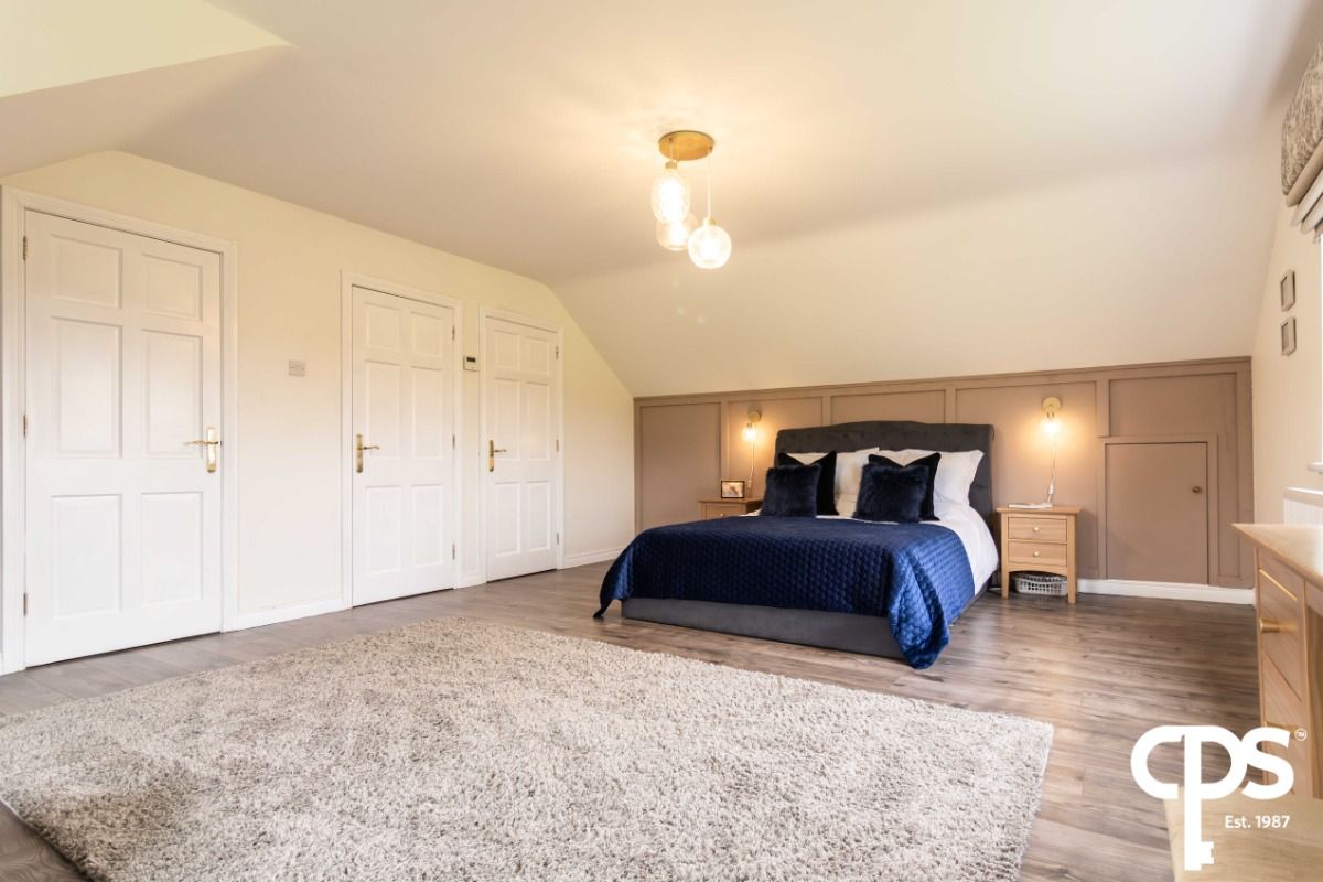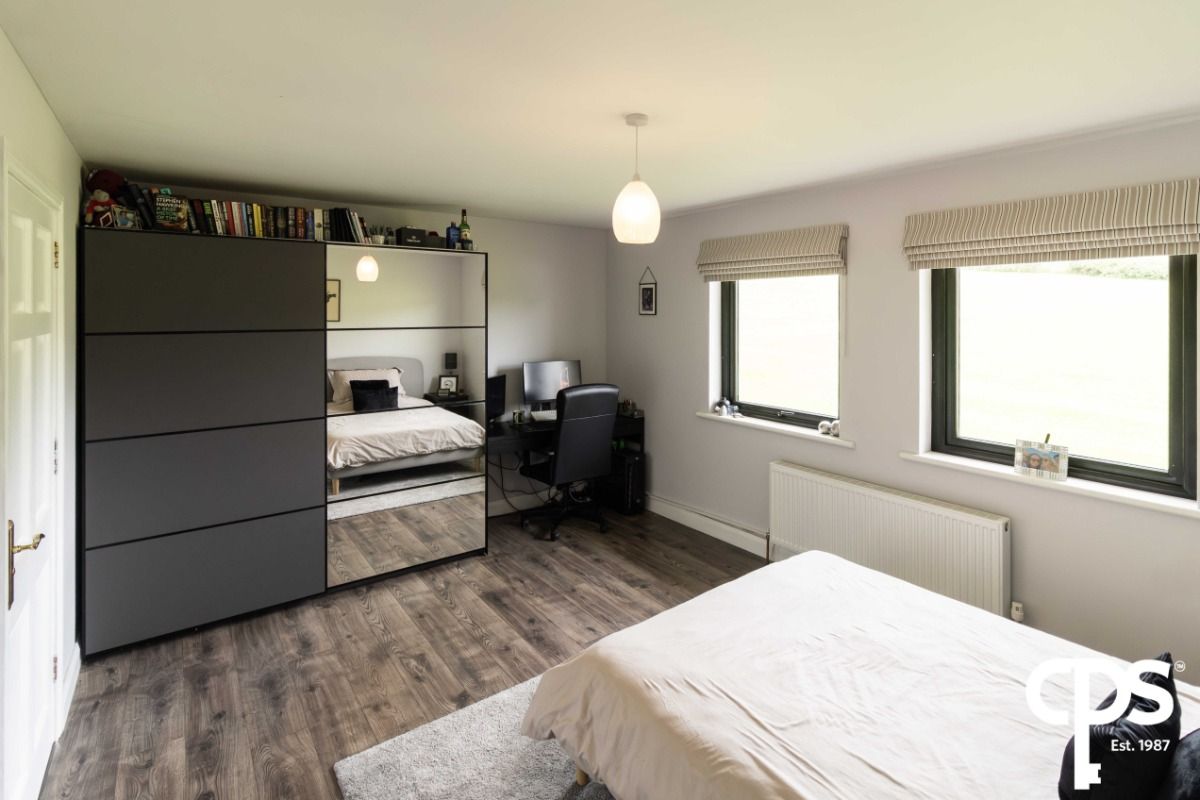 the fourth double bedroom on the first floor of the property features wood effect laminate flooring with access to additional built in storage unit. The room benefits from pleasant countryside views, electrical points throughout and attractive modern lighting.