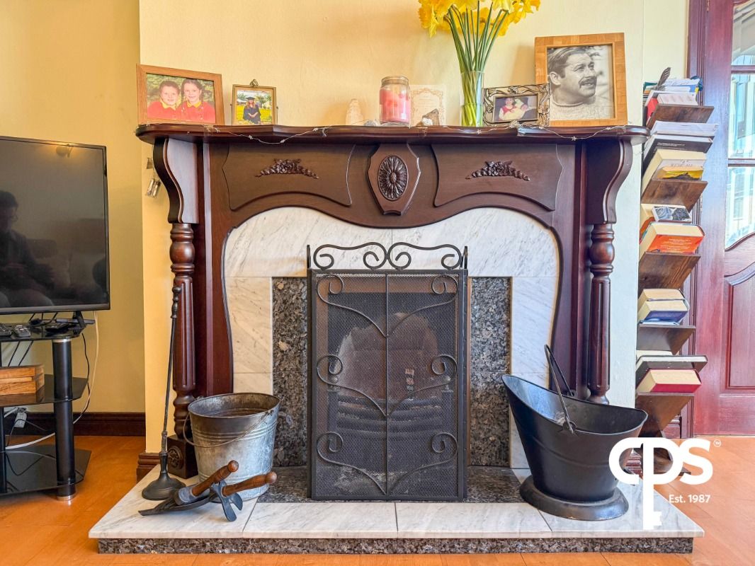Bright front-facing room with wooden flooring, open fireplace, and large window providing excellent natural light.