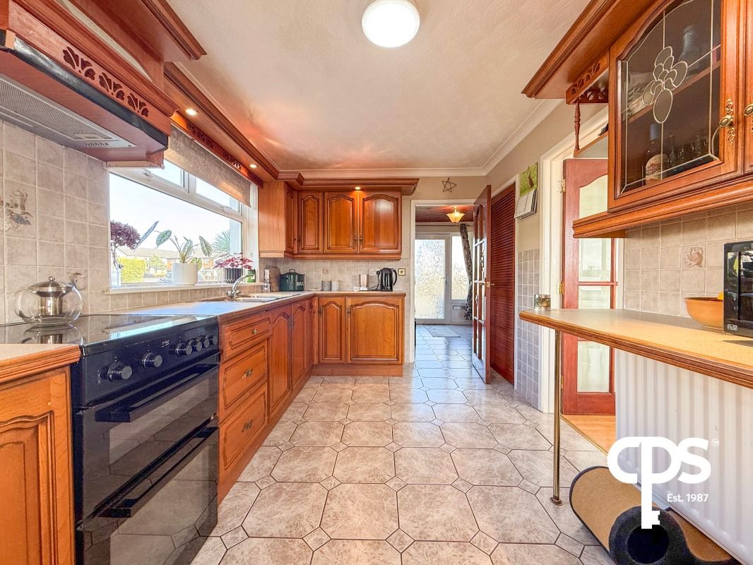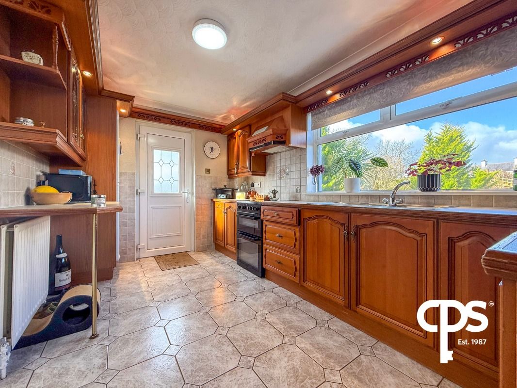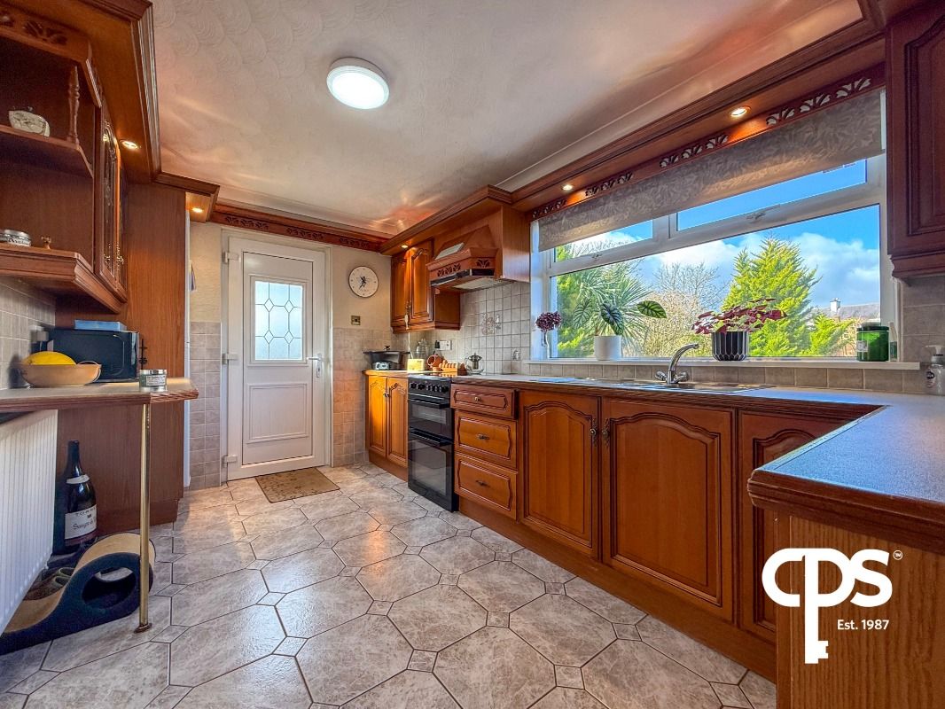 Fitted with high and low wooden units, tiled flooring, and direct access to the rear of the property.