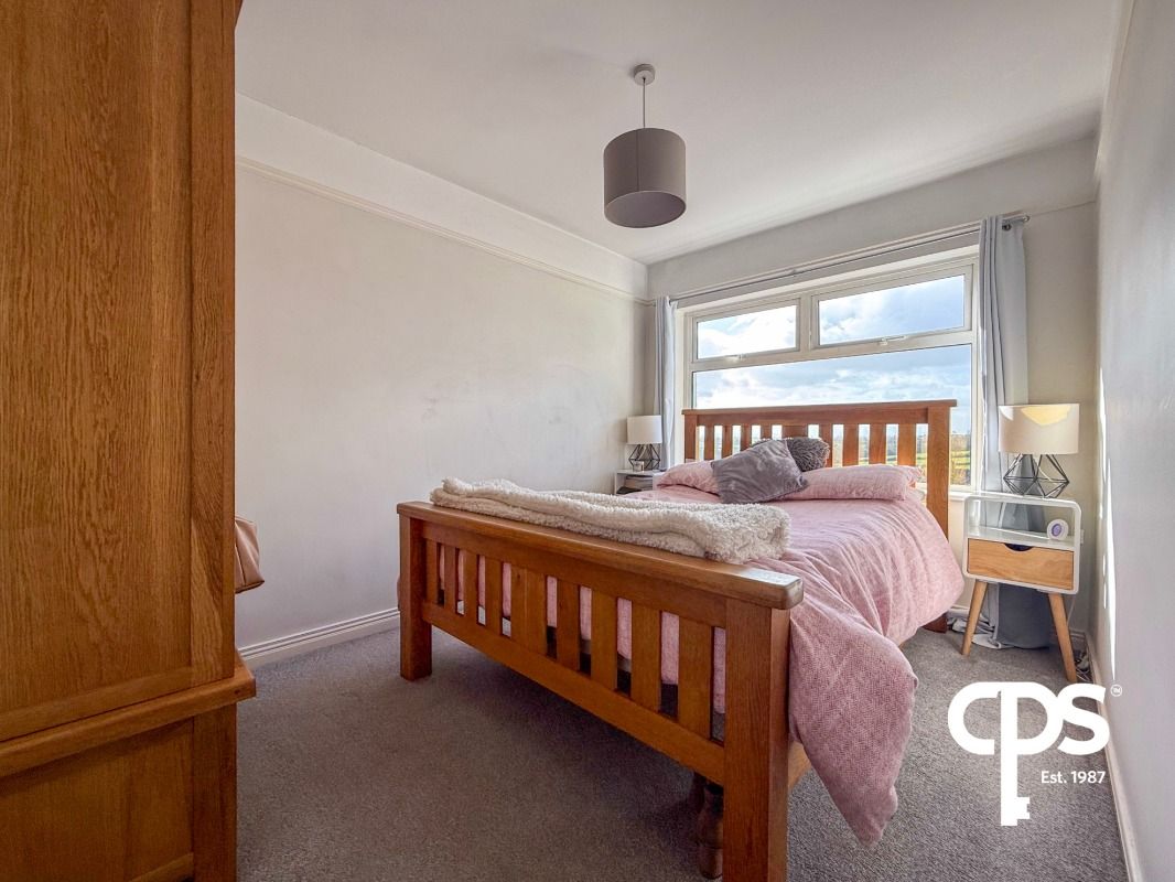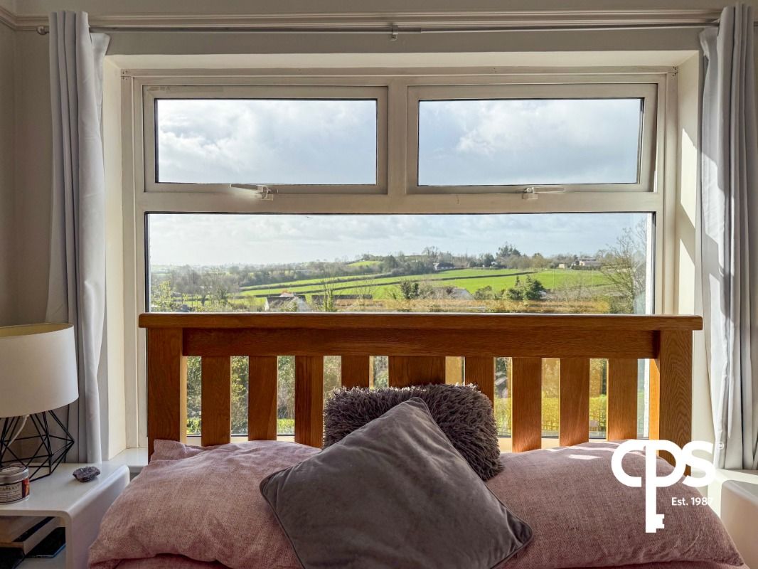 Spacious double bedroom with carpet flooring and views over the countryside.